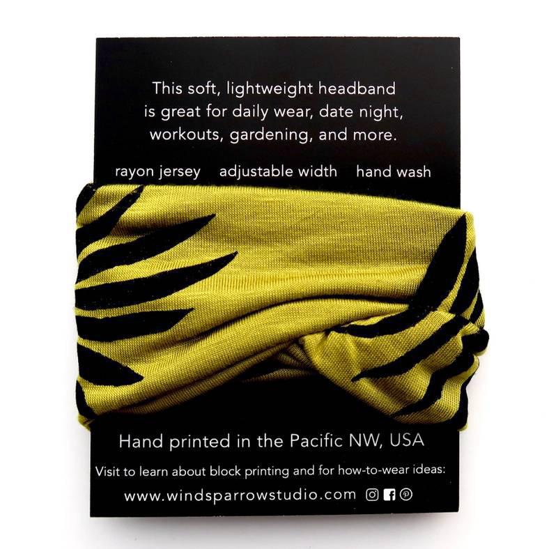 These soft jersey headbands are printed with black ink using hand-carved wooden blocks of the artist's original design.