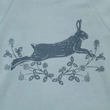 An adorable rabbit bounds across the front of this ultra-comfortable sweatshirt. Screen-printed by hand in teal ink on a soft light blue background. Shirt has a crew neck and long sleeves.