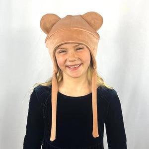 This cozy and fun rosy pink teddy bear hat is made of super-soft velvet that's so stretchy it can fit both kids and adults! The ear flaps and chin tie make it even more snuggly and adorable.