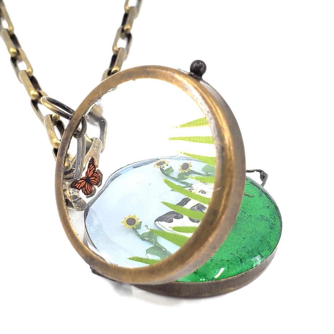 - Materials: Brass shadowbox pendant locket, brass chain, resin, pewter cow, paint, paper sunflowers, metal butterfly, nylon fabric