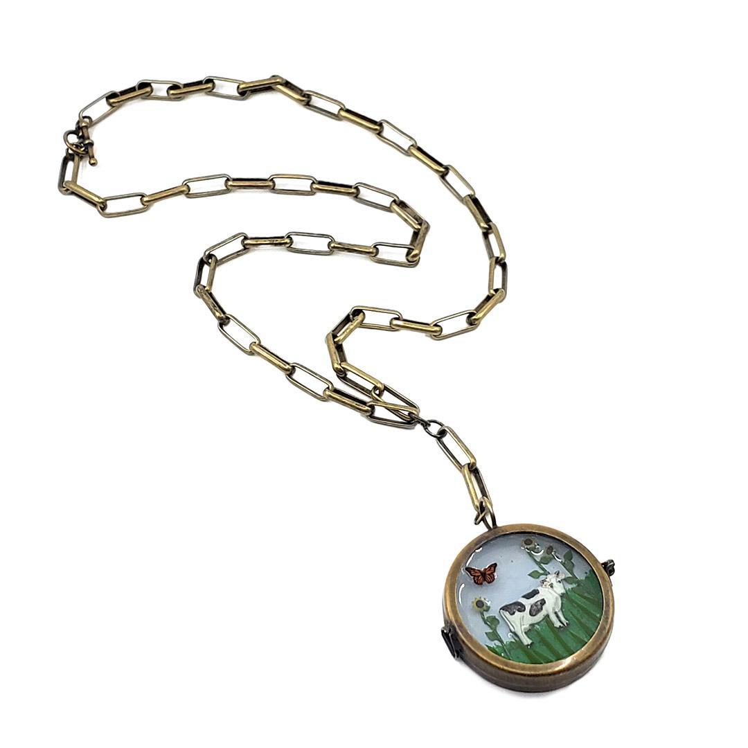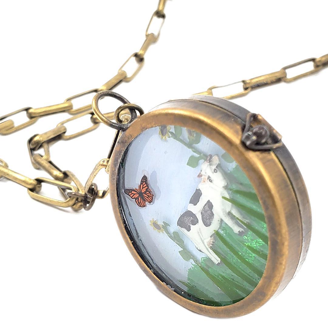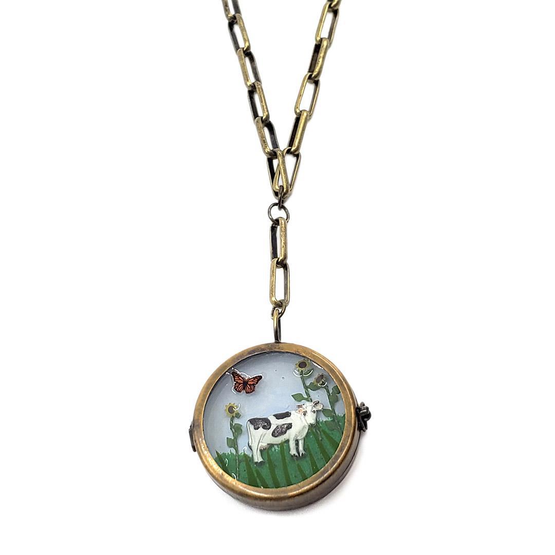 A cow in a green pasture surrounded by sunflowers with a butterfly fluttering overhead in this one-of-a-kind locket. Front opens for viewing and hangs from a 22 inch brass chain.