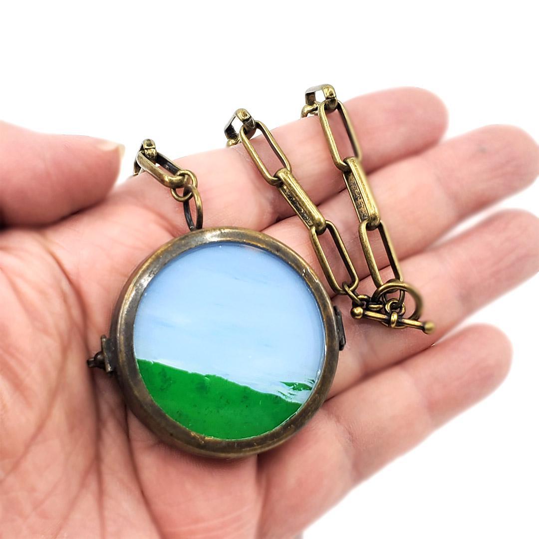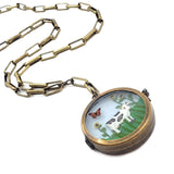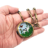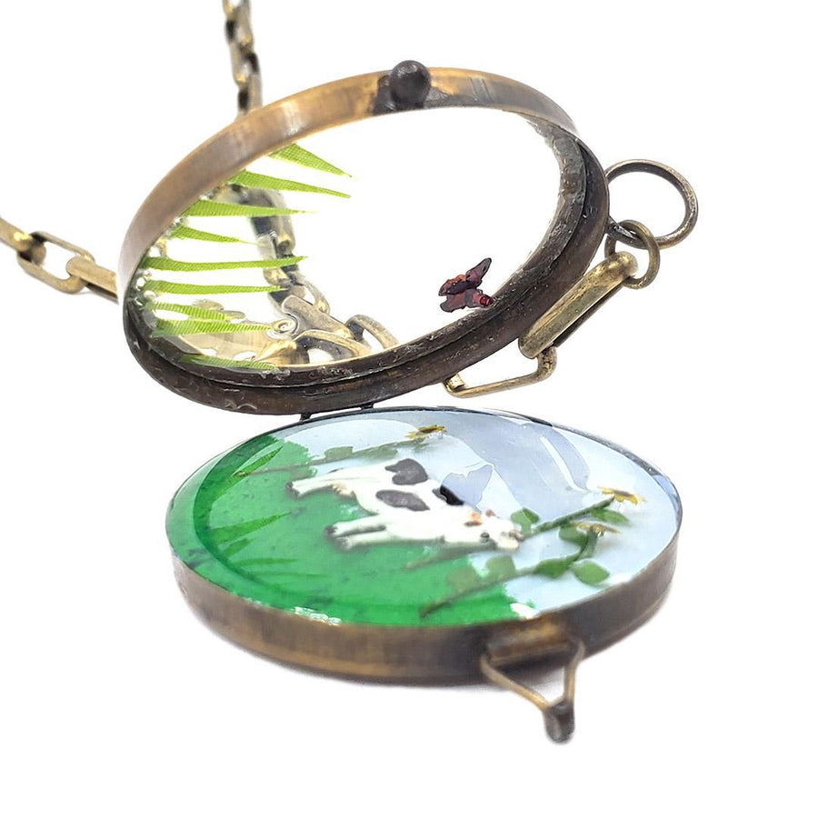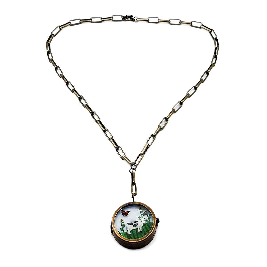 A cow in a green pasture surrounded by sunflowers with a butterfly fluttering overhead in this one-of-a-kind locket. Front opens for viewing and hangs from a 22 inch brass chain.