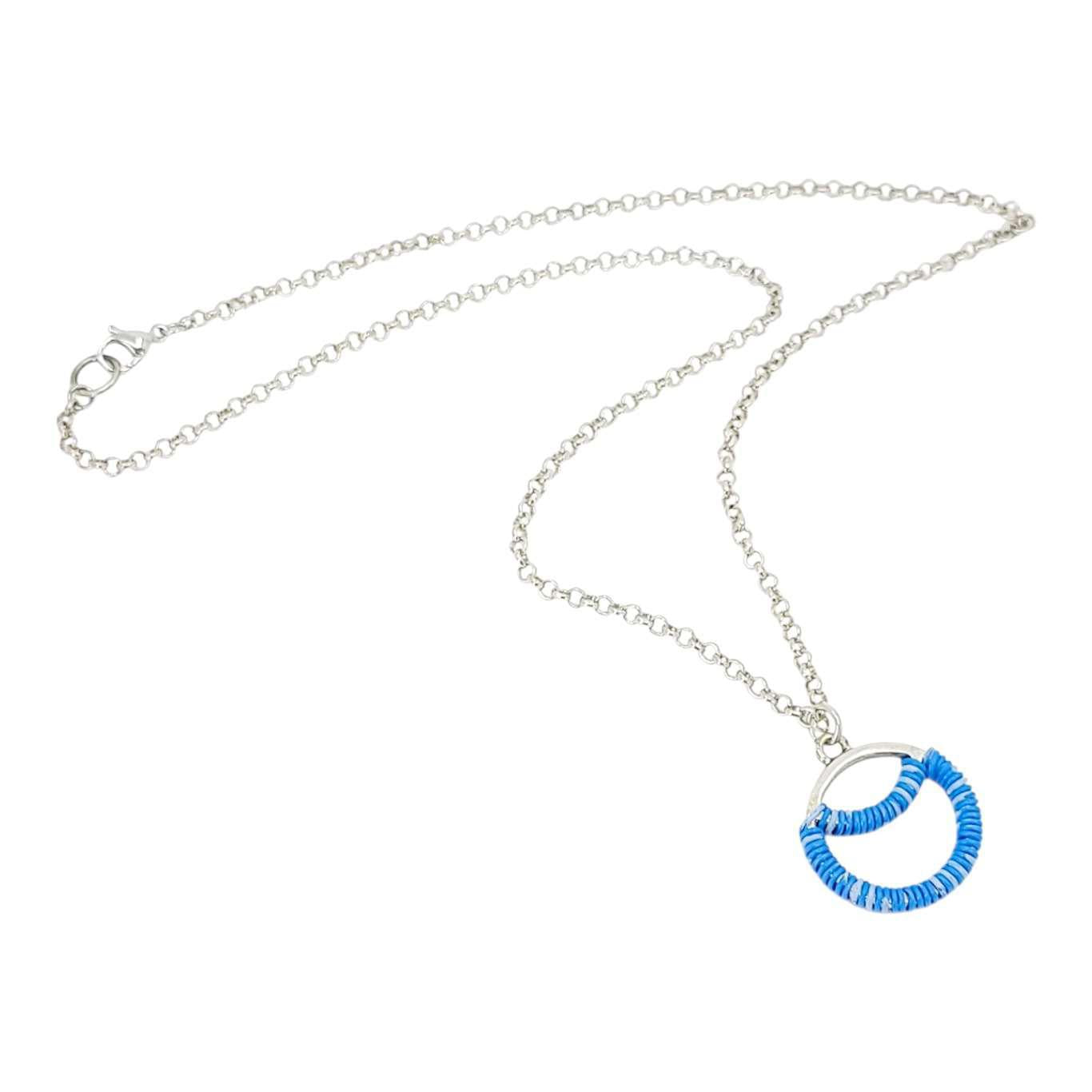 This bold, funky necklace features a segmented circle wrapped with dark and light blue wire used in telecommunications cables, using it to form a colorful and textured accent against the silver metal.
