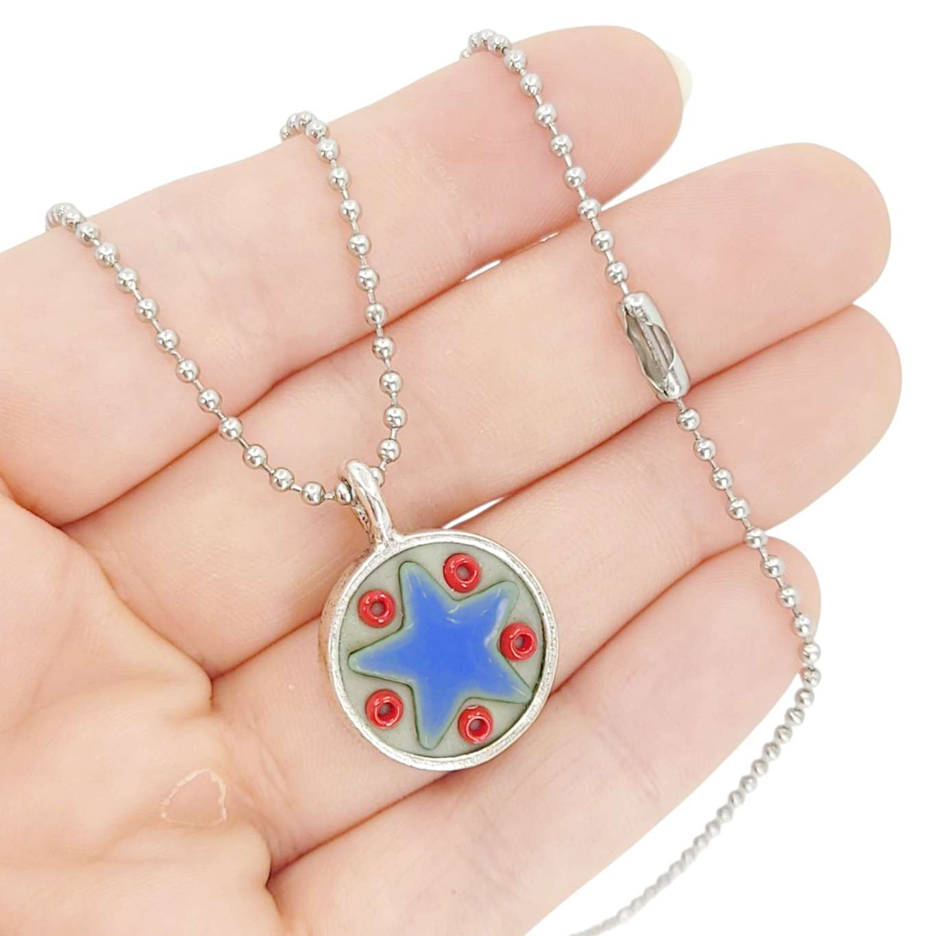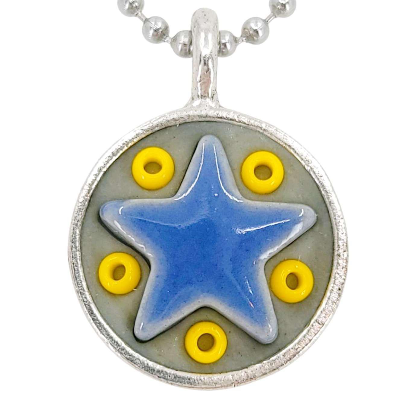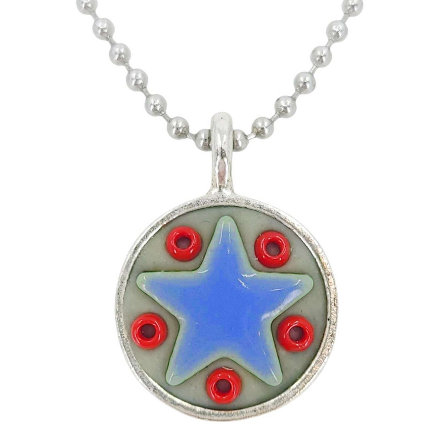 These Star Baby necklaces are a funky pairing of blue ceramic stars and colorful glass beads in a round silver pendant - choose your favorite combo!