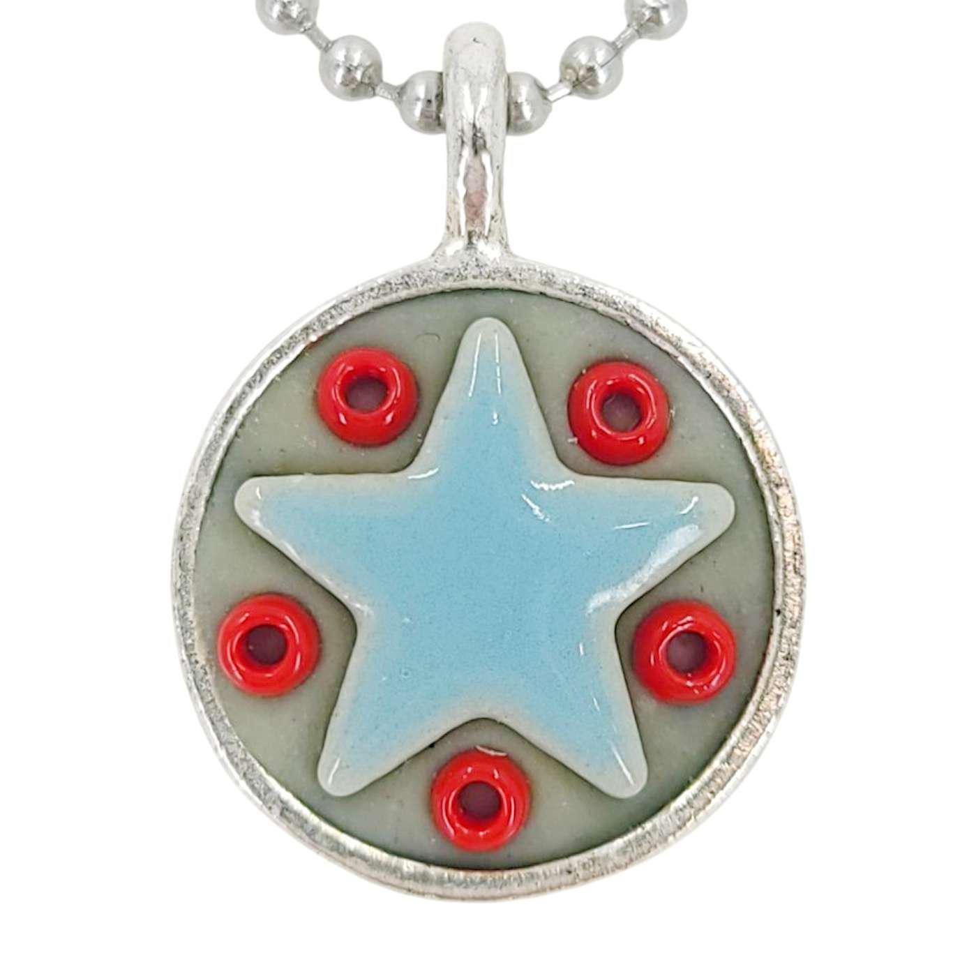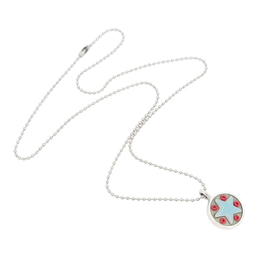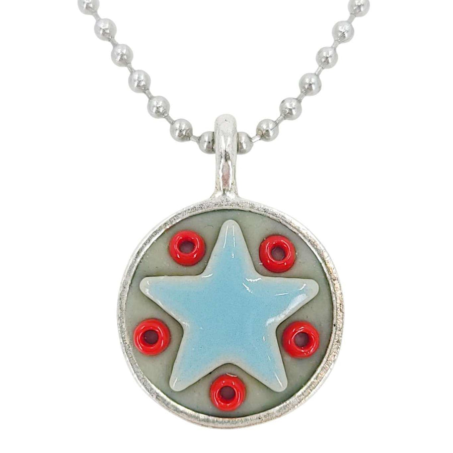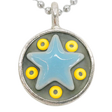 These Star Baby necklaces are a funky pairing of light blue ceramic stars and colorful glass beads in a round silver pendant - choose your favorite combo!