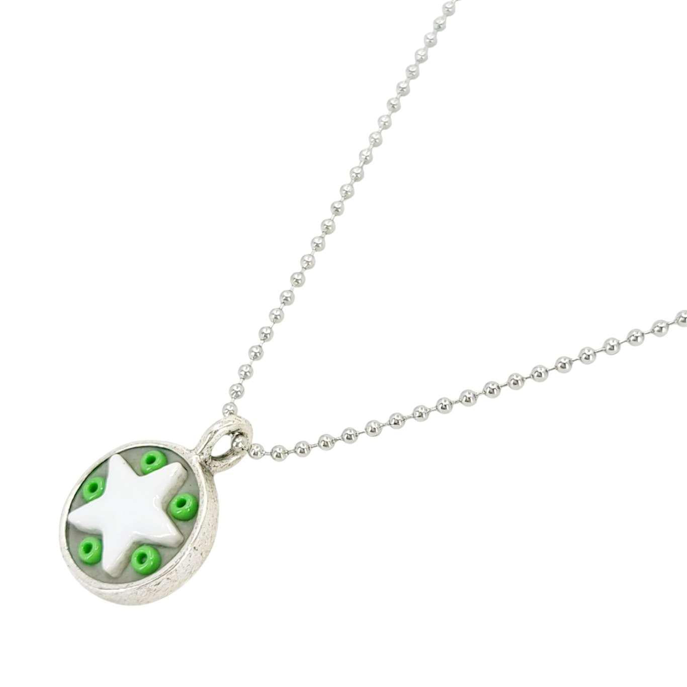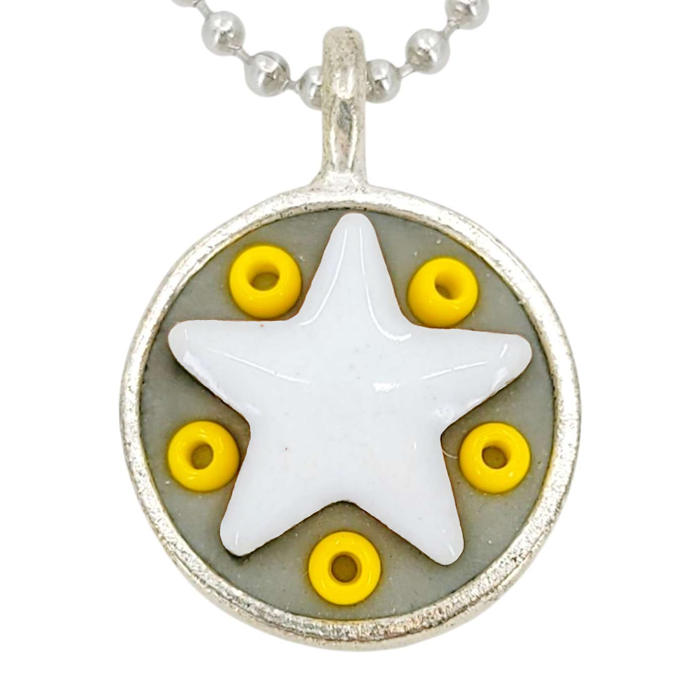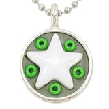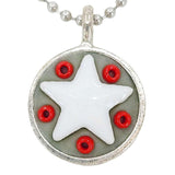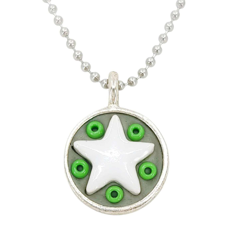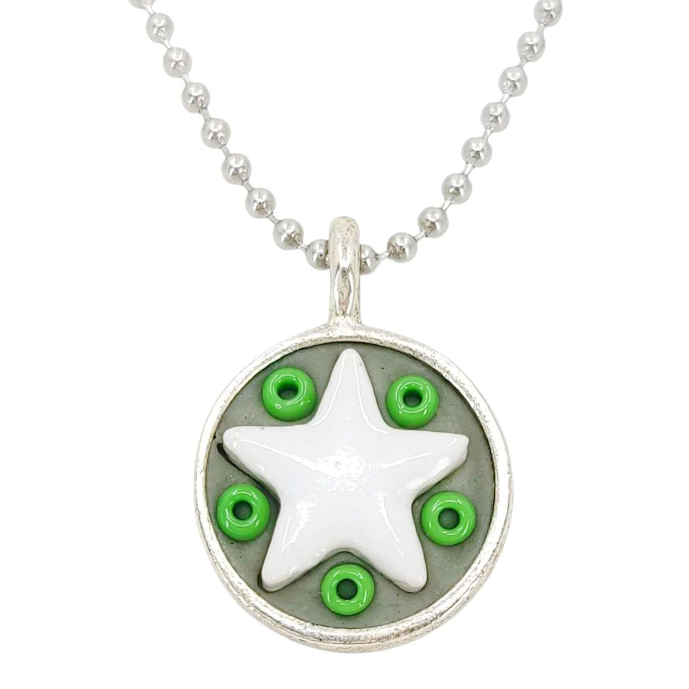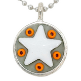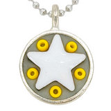 These Star Baby necklaces are a funky pairing of white ceramic stars and colorful glass beads in a round silver pendant - choose your favorite combo!