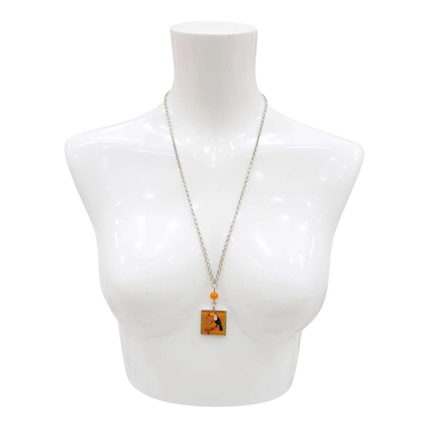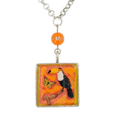 This bold tropical necklace features a clever toucan perched on a branch next to a yellow butterfly, all encased in resin with an orange bead accent.