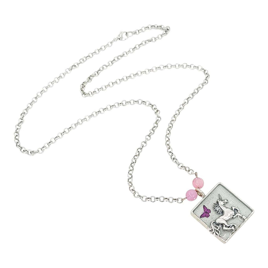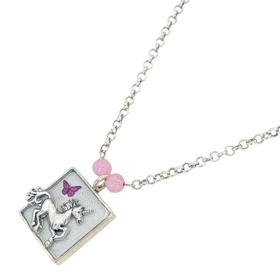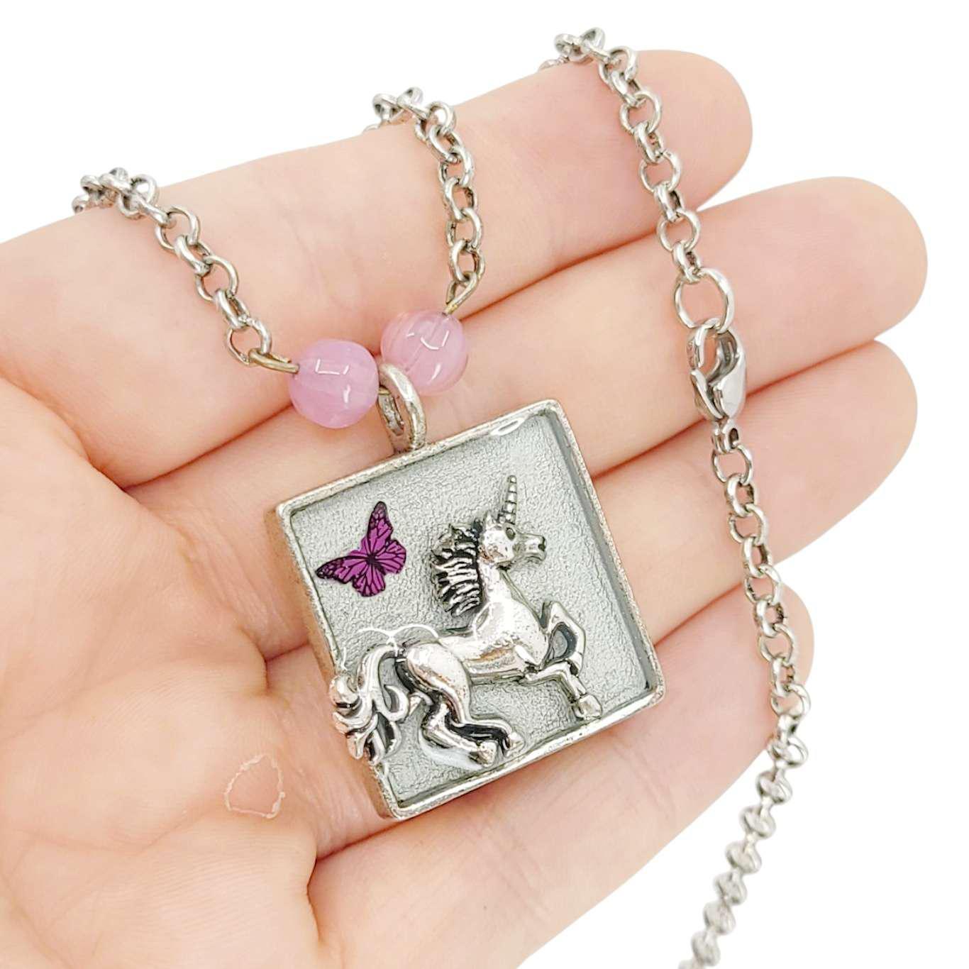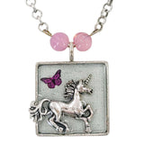 This magical necklace features a trotting metal unicorn and a hot pink butterfly, all encased in resin with pink bead accents.