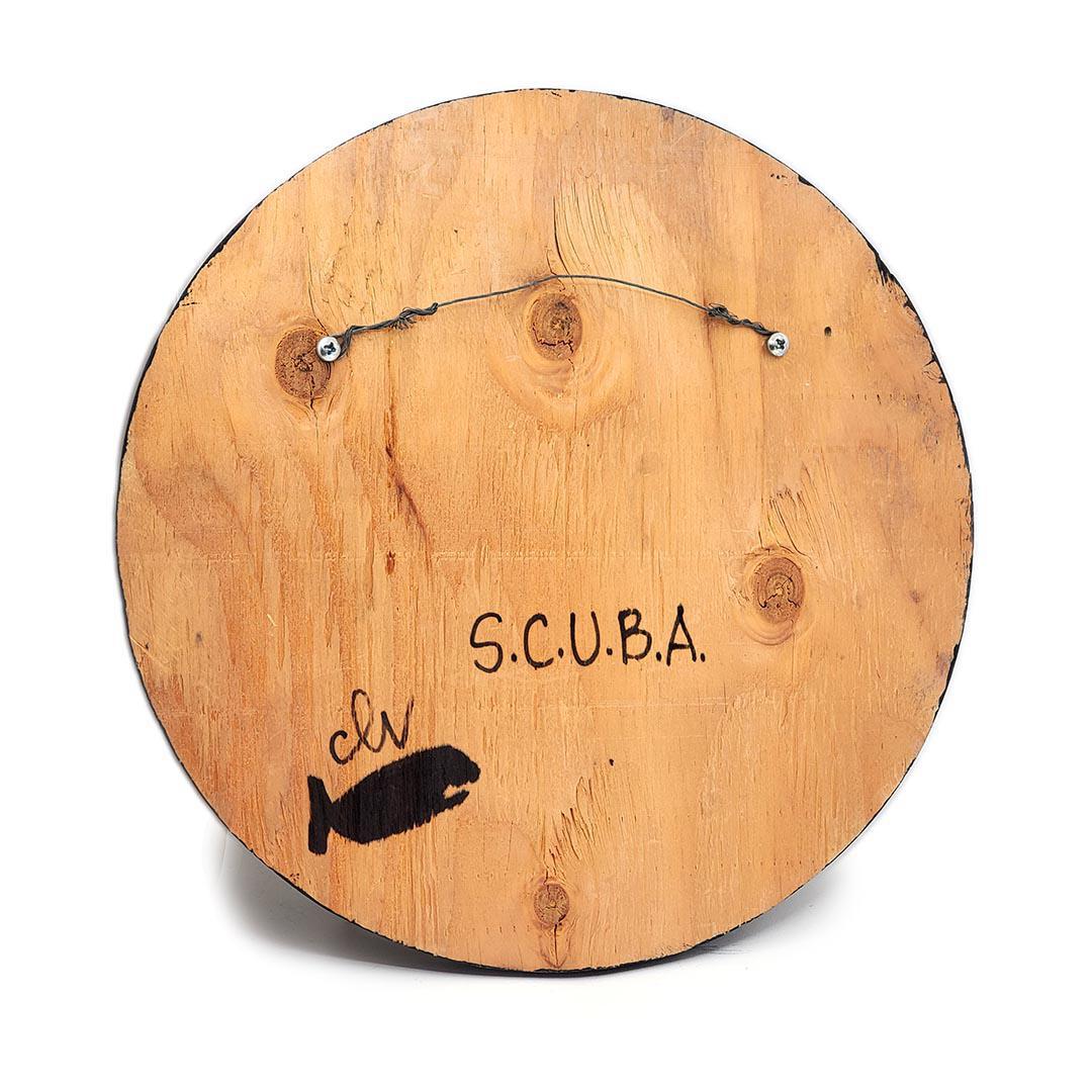 This one-of-a-kind mosaic piece features a close-up of a SCUBA diver peering into a repurposed brass porthole. Thumbscrews secure the hinged door and can be loosened to observe the artwork further.