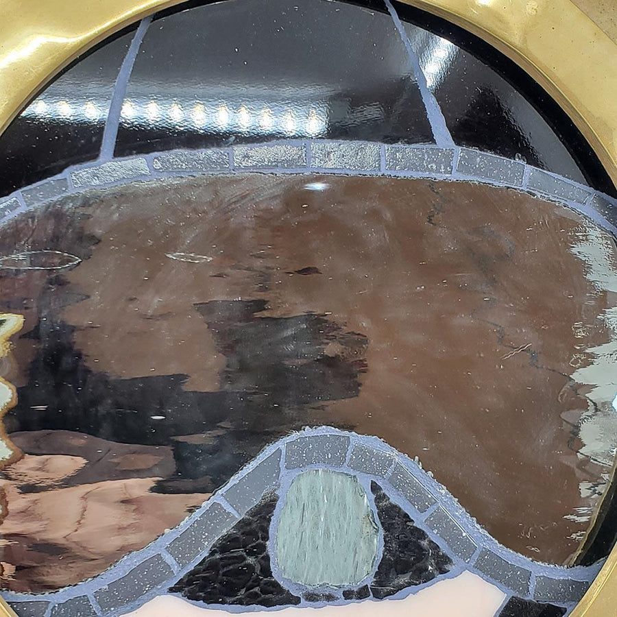 - Materials: Stained glass, grout, repurposed brass boat porthole mounted to a wood backing with hanging wire attached