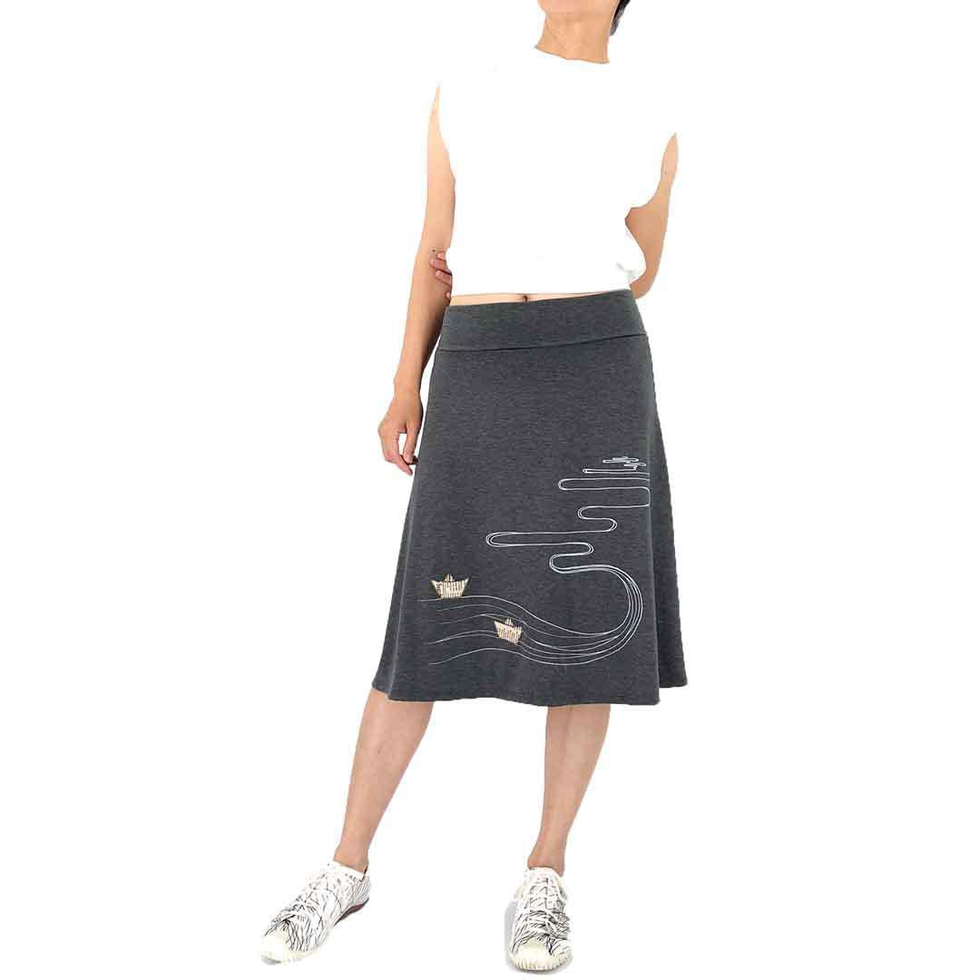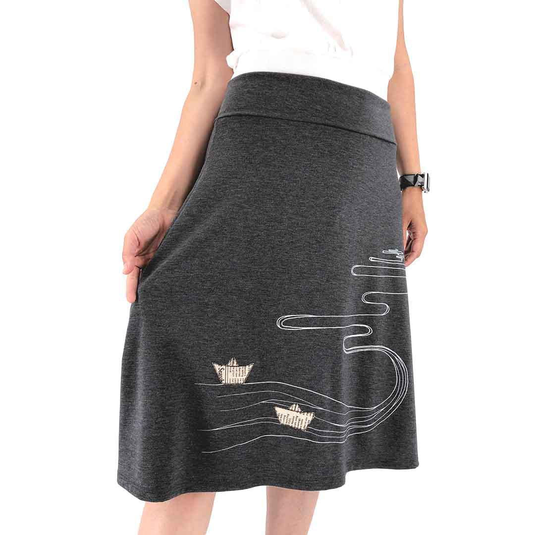 A softly flowing screenprinted river on a soft gray skirt with 2 appliqued canvas "paper" boats that appear to drift along the river. The applique fabric is even newspaper print for extra detail.