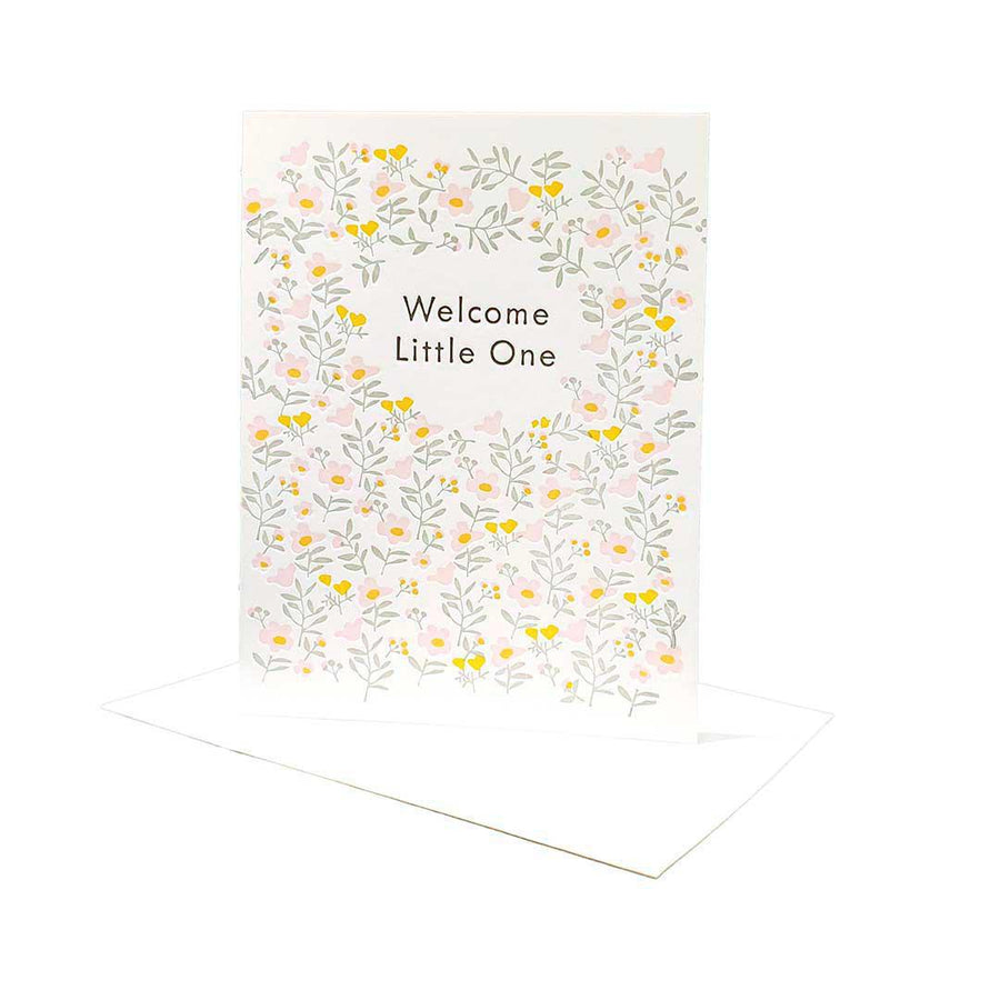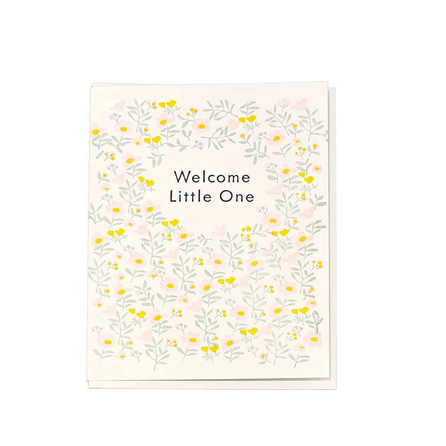 A lovely letterpress card with a field of tiny pastel pink and yellow flowers with green leaves and the words, "Welcome Little One" in the center. Adorable!