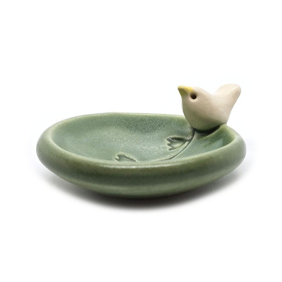 A sweet little bird is perched on this shallow green dish with a fern impressions.