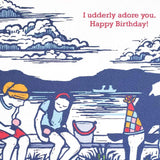 Adapted from an original block print, this charming card features a lakeside scene where two friends celebrate their beloved cow’s birthday. The playful message “I udderly adore you. Happy Birthday!” is printed in cheerful red ink on the top right of this vertically opening card.