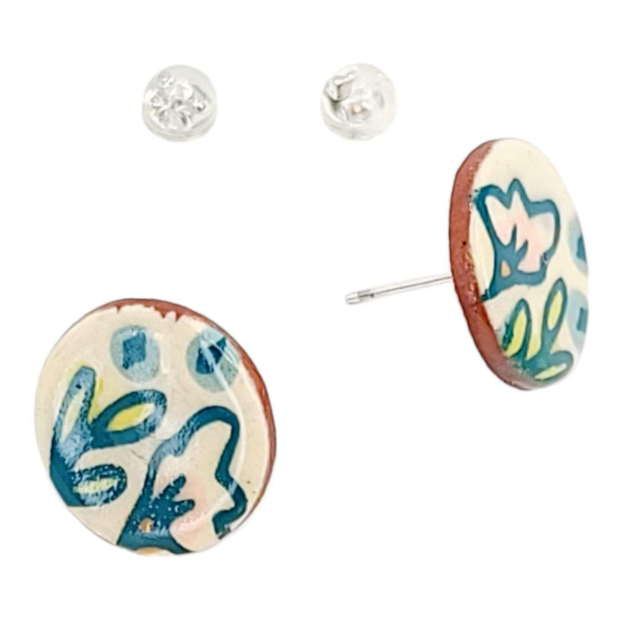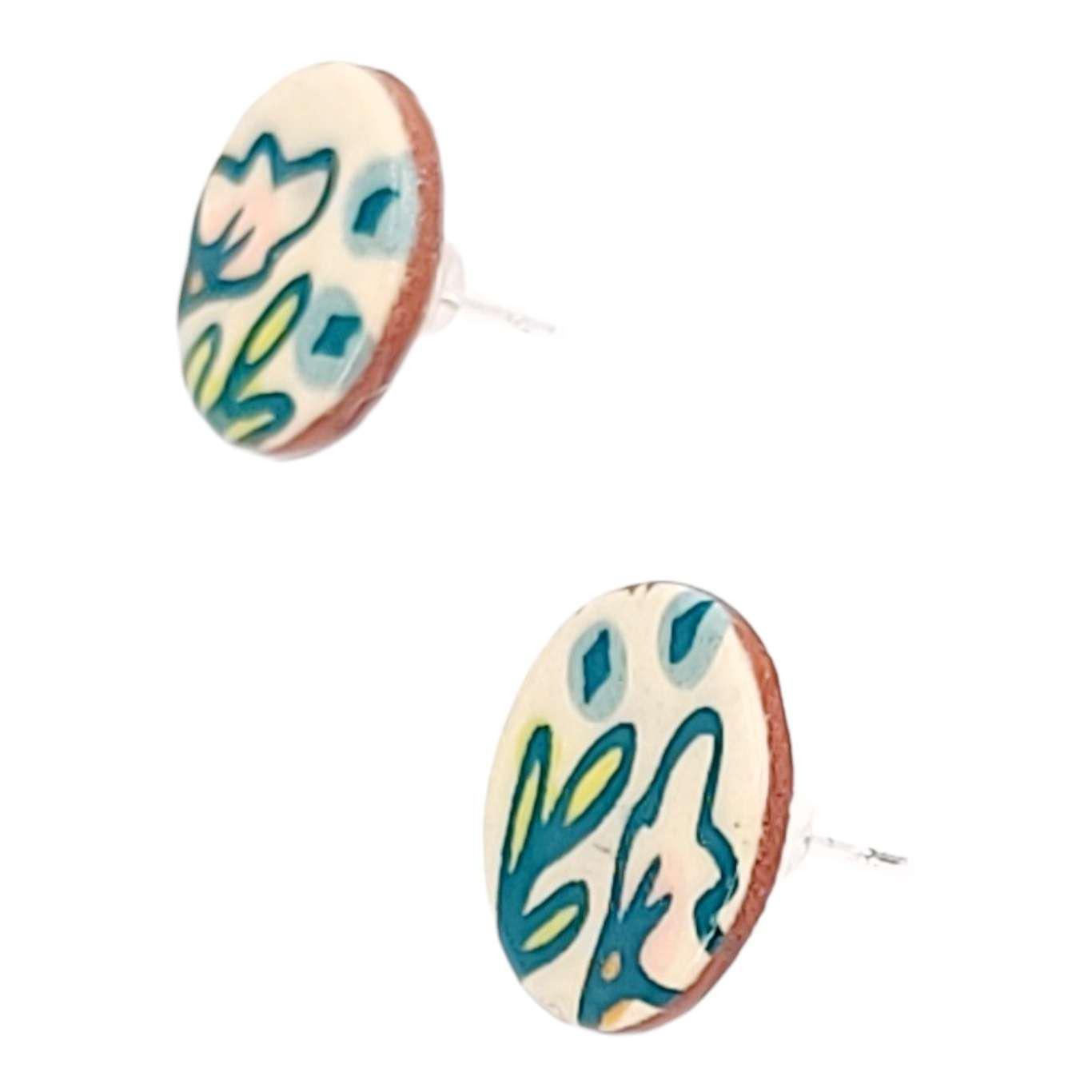 These adorable stud earrings are made of terracotta clay with a glazed floral and berries design on the front and a textured back featuring the bare rich red clay.