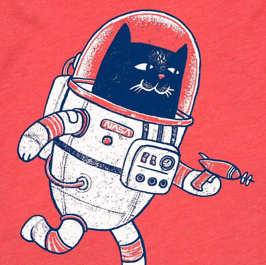 A happy-go-lucky ray gun-toting cat in a space suit is screenprinted on a super-soft triblend tee in red.