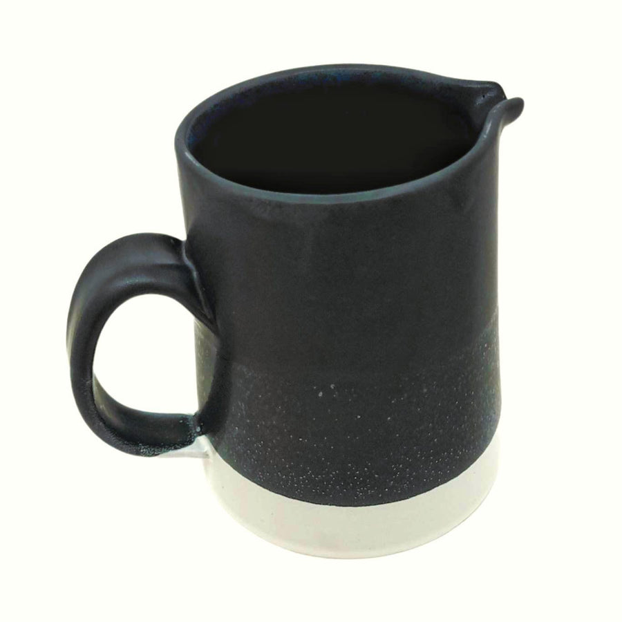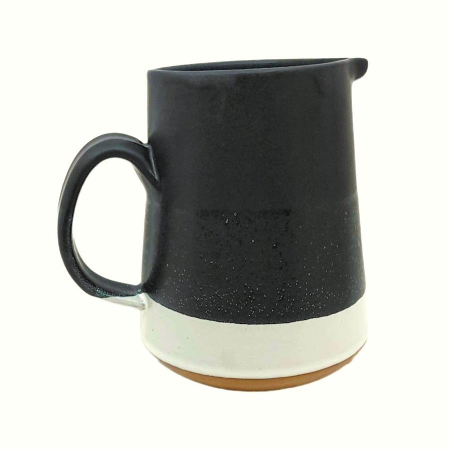 This handmade ceramic pitcher is hand-thrown and glazed bold charcoal gray and white. Handmade from stoneware clay with a gradient glaze design that creates a lighter central “horizon” stripe with gorgeous natural variation making each piece unique. Thick ceramic walls keep the pitcher’s contents insulated and the thoughtfully designed spout means it pours like a dream. Microwave and dishwasher safe.
