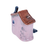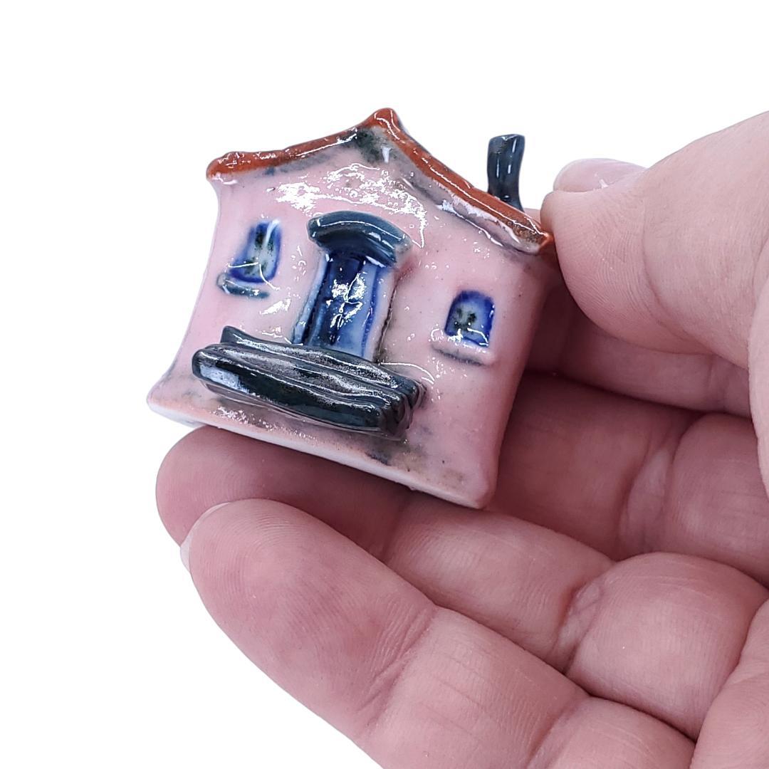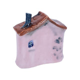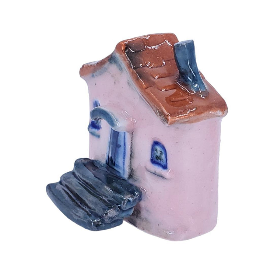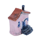 This adorable little ceramic house is beautifully detailed and one-of-a-kind with its soft pink walls, blue door with large black steps, and rusty red roof.