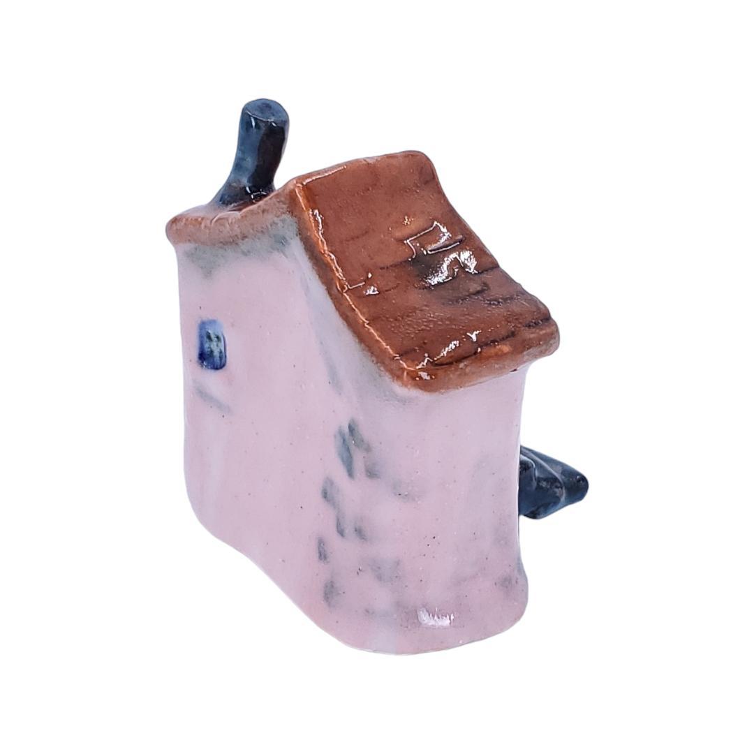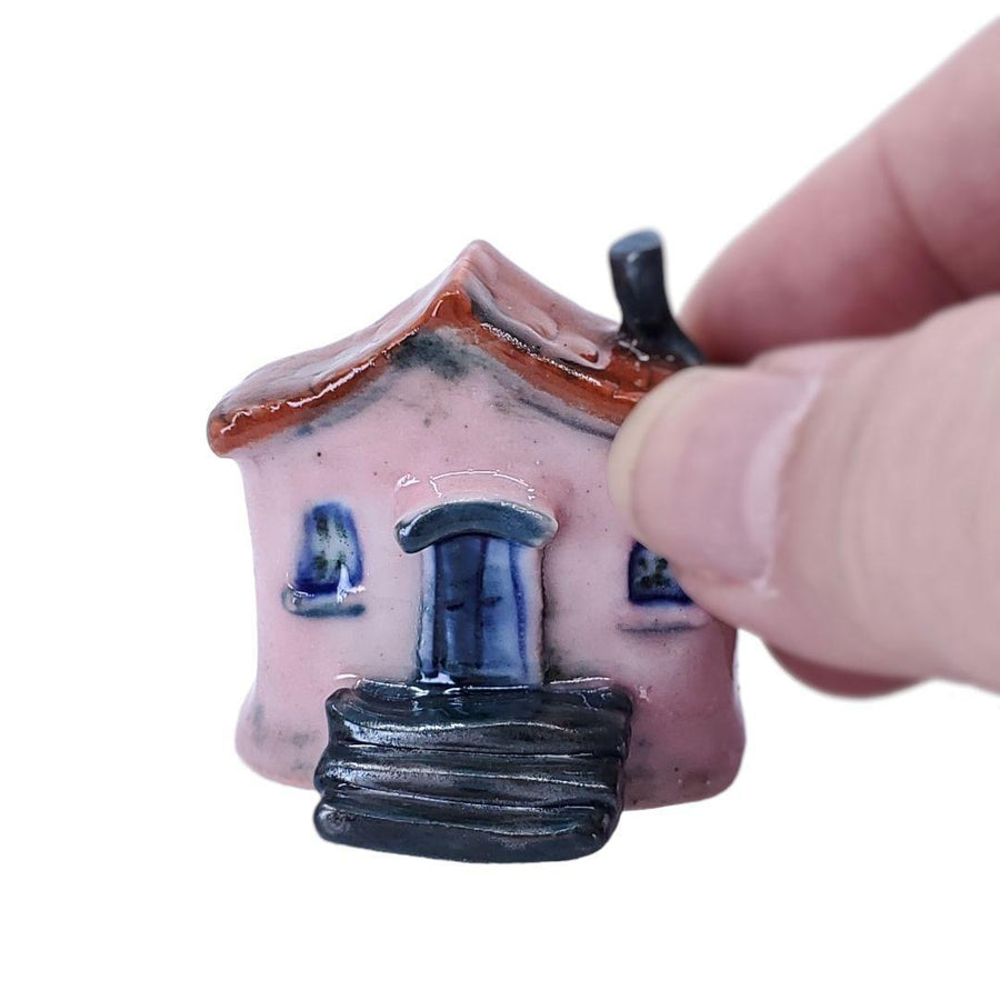 Tiny House - Pink House Black Steps Rust Roof by Mist Ceramics
