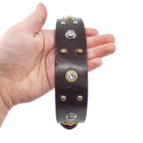- Deep red wine-colored leather with silver and gold studs and sparkly clear crystal accents