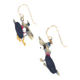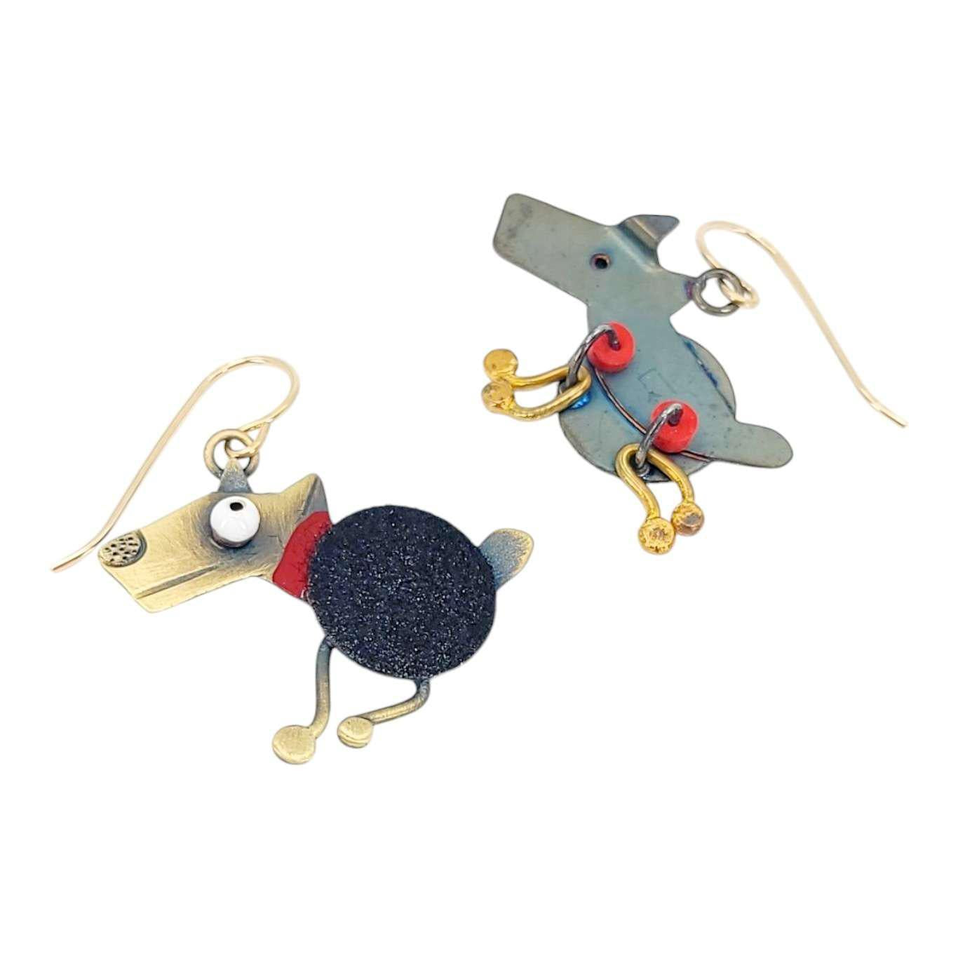 Adorable little canines, one sitting and one scampering on freely-moving legs, feature on these super cute brass and enamel dangle earrings with gold fill ear wires. Chickenscratch creates pieces with whimsy, movement, and a funky edge that will set you apart from the crowd!