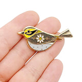A townsend warbler enamel pin in Amber Leaders' signature mid-century modern style.