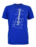 This guitar diagram tee is perfect for beginners and virtuosos, alike. Strike a chord with the music lovers in your life. Screen printed in White ink on Royal cotton/poly tees