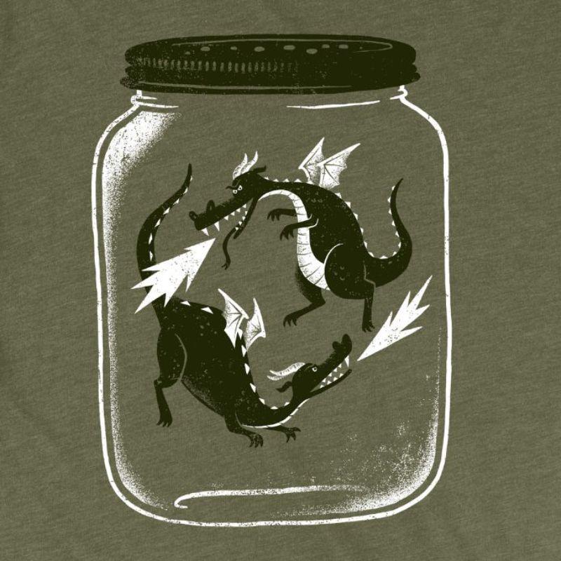 We bet you've never quite caught dragonflies like this! Our super soft olive green tee features an illustration of two (2) dragonflies breathing fire!