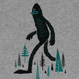 A friendly (but also slightly startled looking) sasquatch striding through the forest is screenprinted on a super-soft triblend tee in gray.