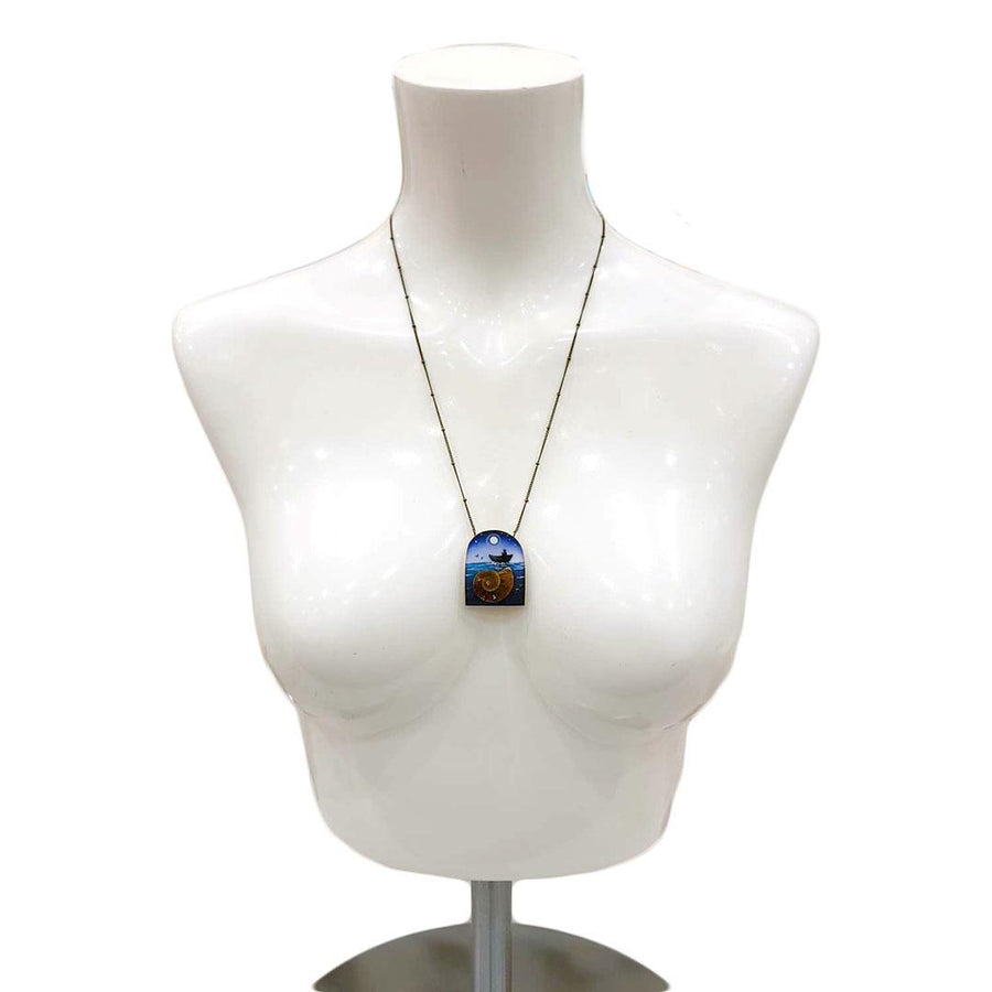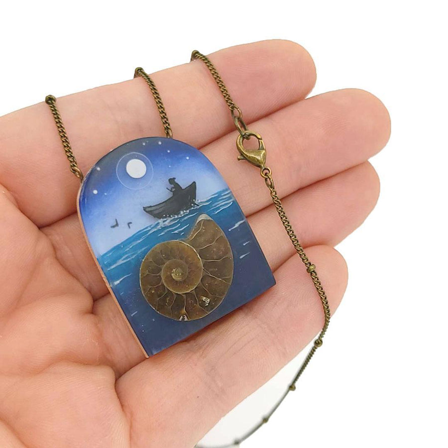 This stunning necklace features a boat being rowed by a lonely sailor while birds fly in the distance, all in front of a starry night sky and accented with a real ammonite fossil.