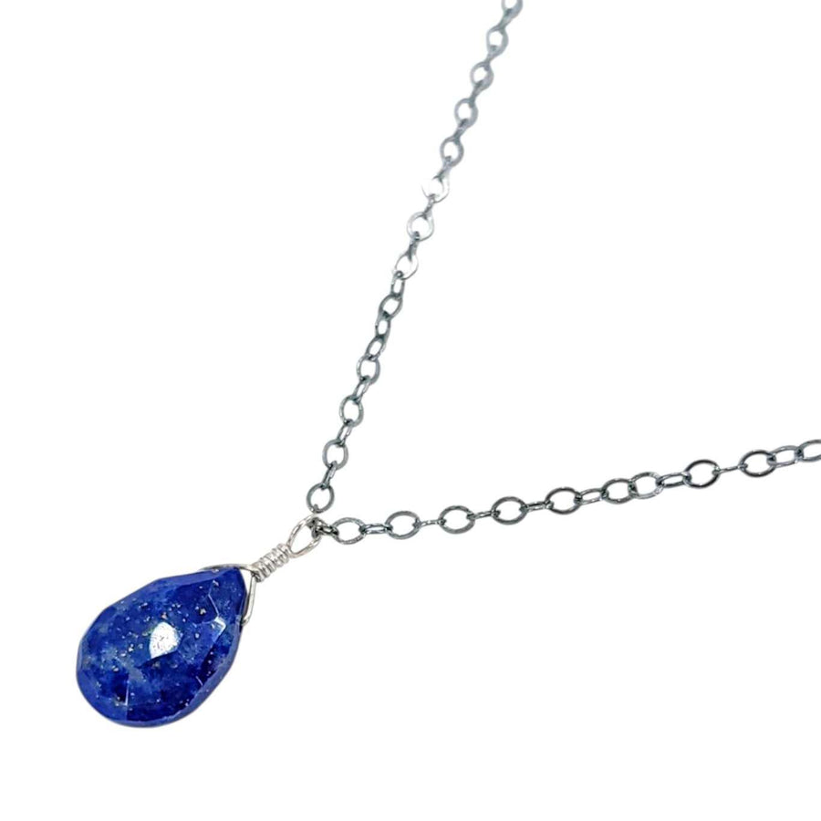 A faceted teardrop of midnight blue lapis lazuli with gold flecks rests on an 18-inch oxidized sterling silver chain.