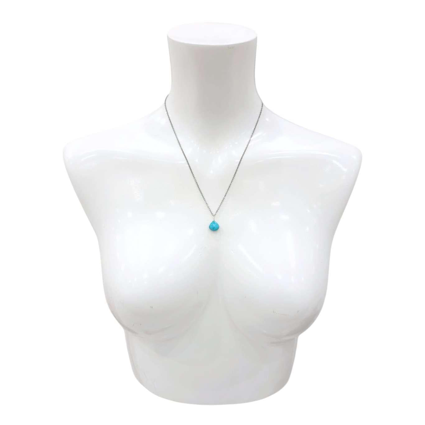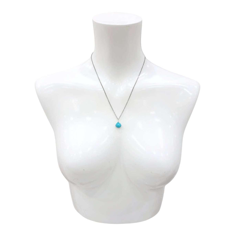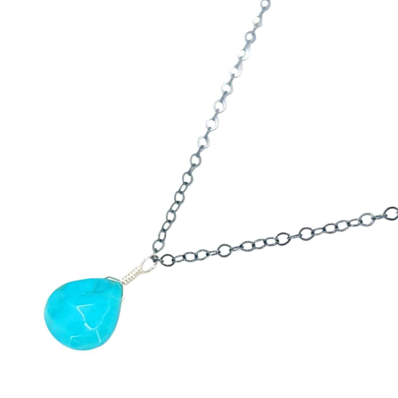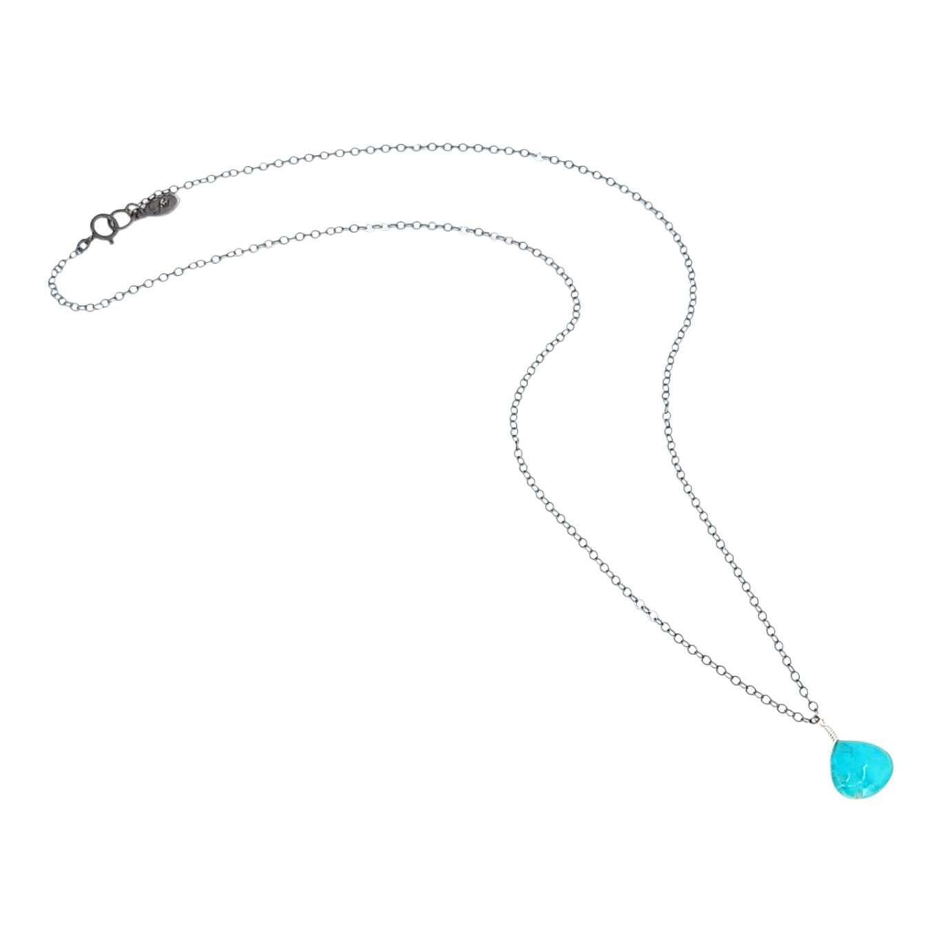 A faceted teardrop of vibrant aqua blue turquoise rests on an 18-inch oxidized sterling silver chain.