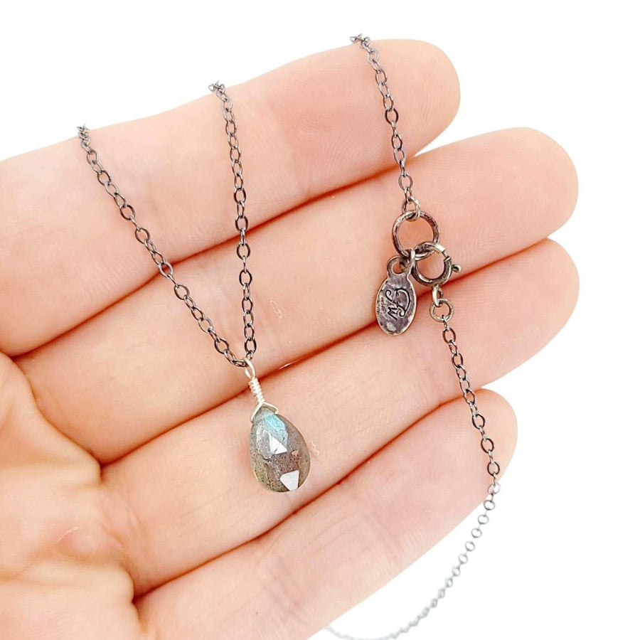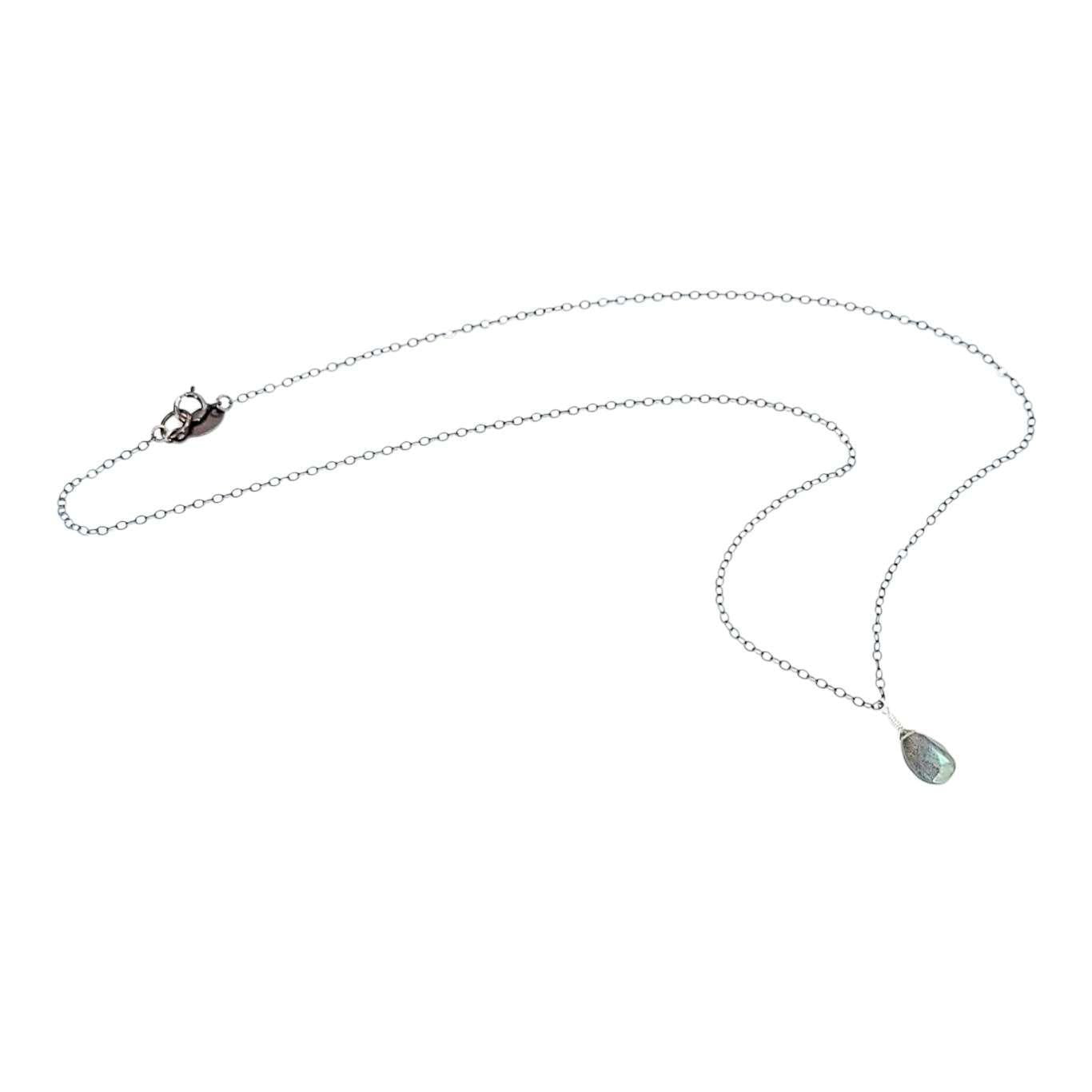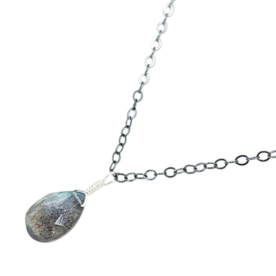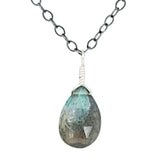 A faceted teardrop of labradorite, with its characteristic blue/green shimmering flash, rests on an 18-inch oxidized sterling silver chain.