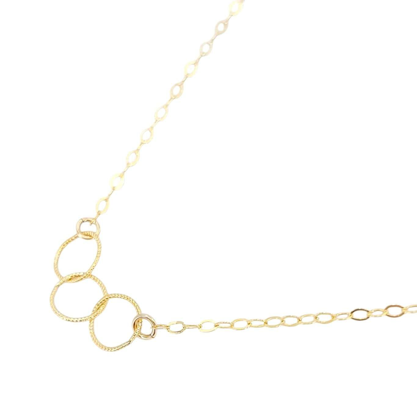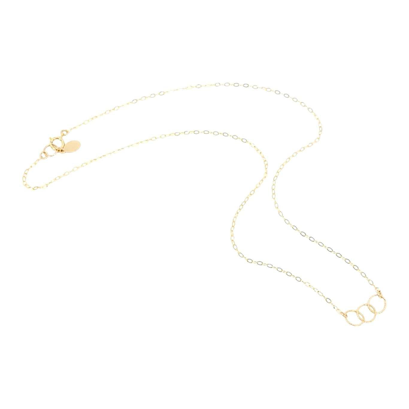 Three delicate rope-textured circles of 14k yellow gold fill interlock on a 17-inch gold fill chain.