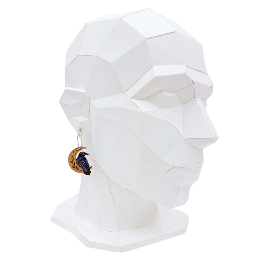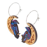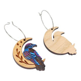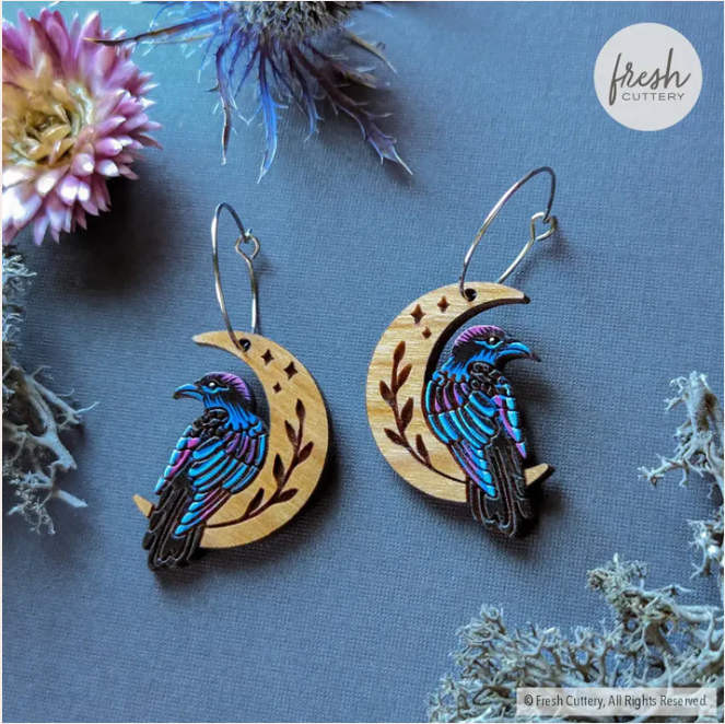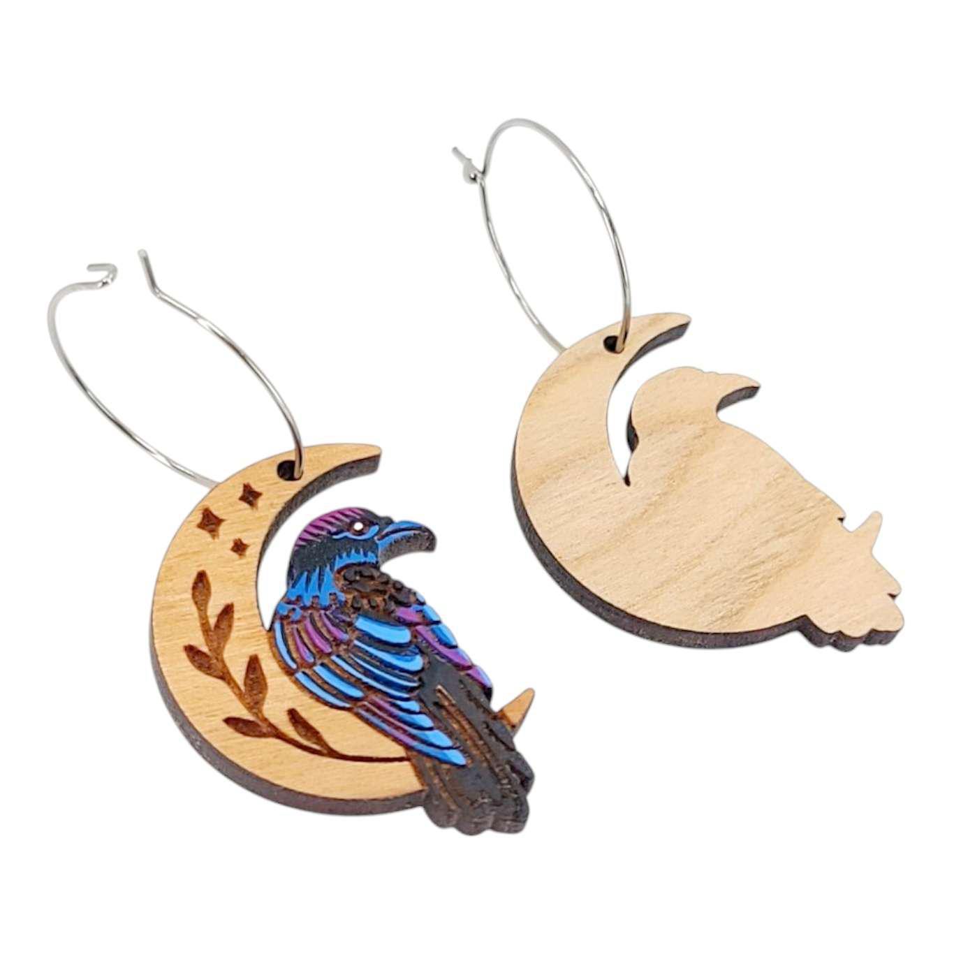 - Hoop earrings featuring hand-painted wood ravens on crescent moons