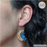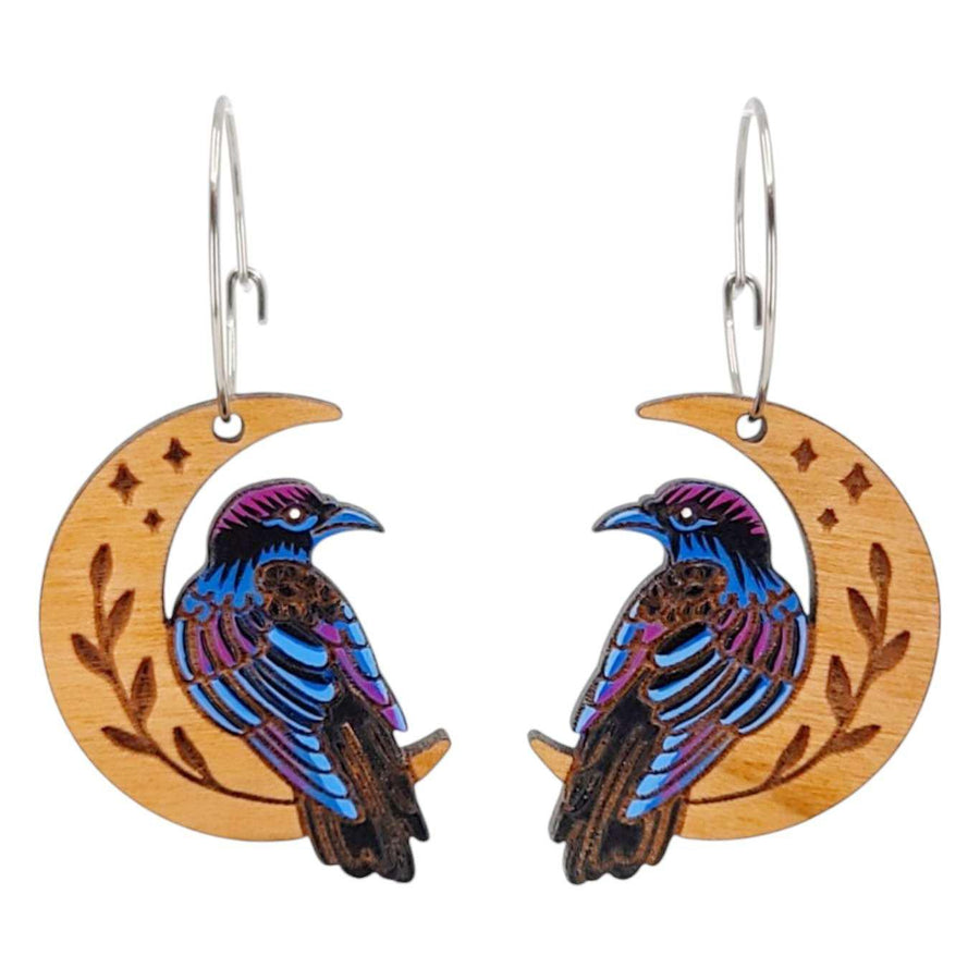 These original earrings are digitally illustrated and laser-etched on cherry wood featuring a crescent moon etched with vines and stars with a raven perched on the bow of the moon. The raven is meticulously hand-painted in black with shading in blue and purple to bring out the details of its wings and give dimension.