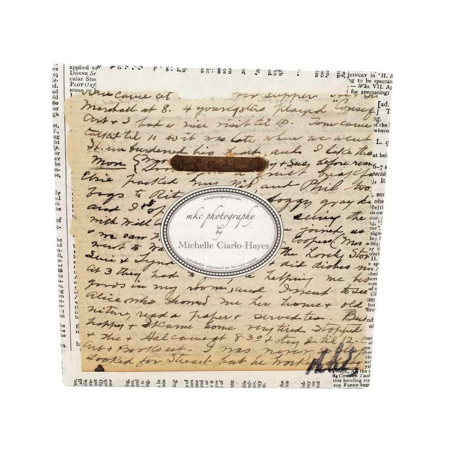 The block edges and backside are covered with vintage book pages, and the block is sealed with multiple layers of non-toxic matte varnish and signed on the reverse. It has a keyhole opening in the back for ease of hanging.