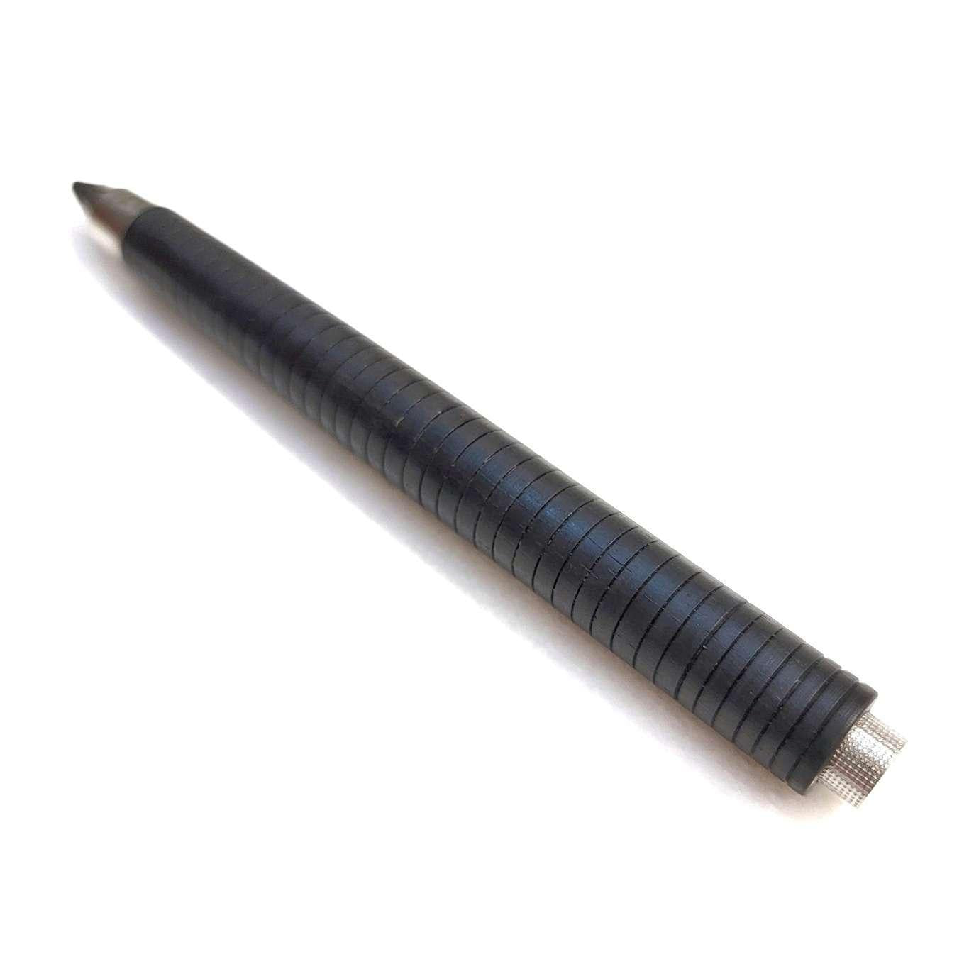 - Materials: Reclaimed wood (ebony), metal clutch mechanism and pusher with lead sharpener, ballpoint pen converter