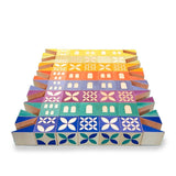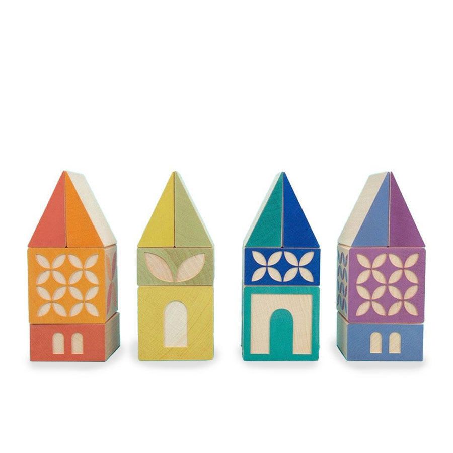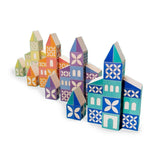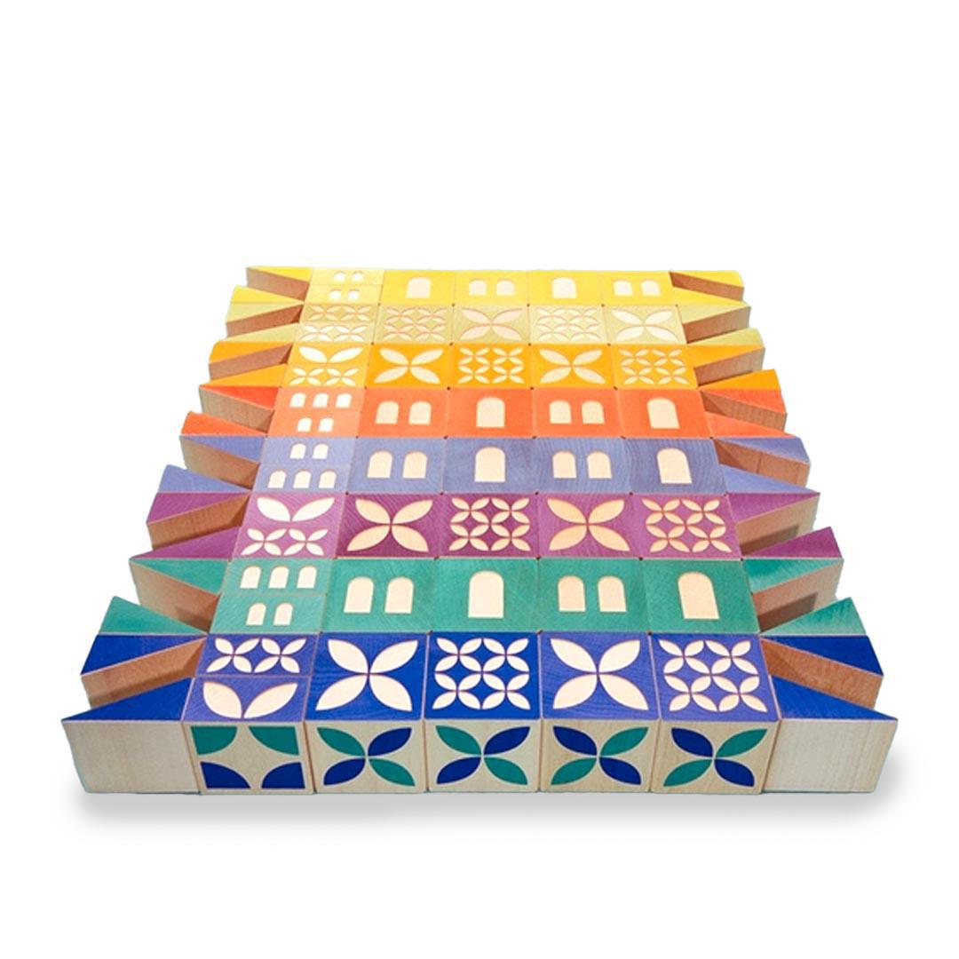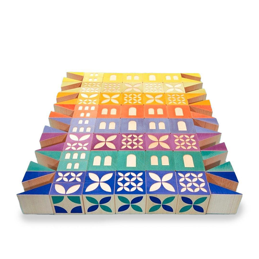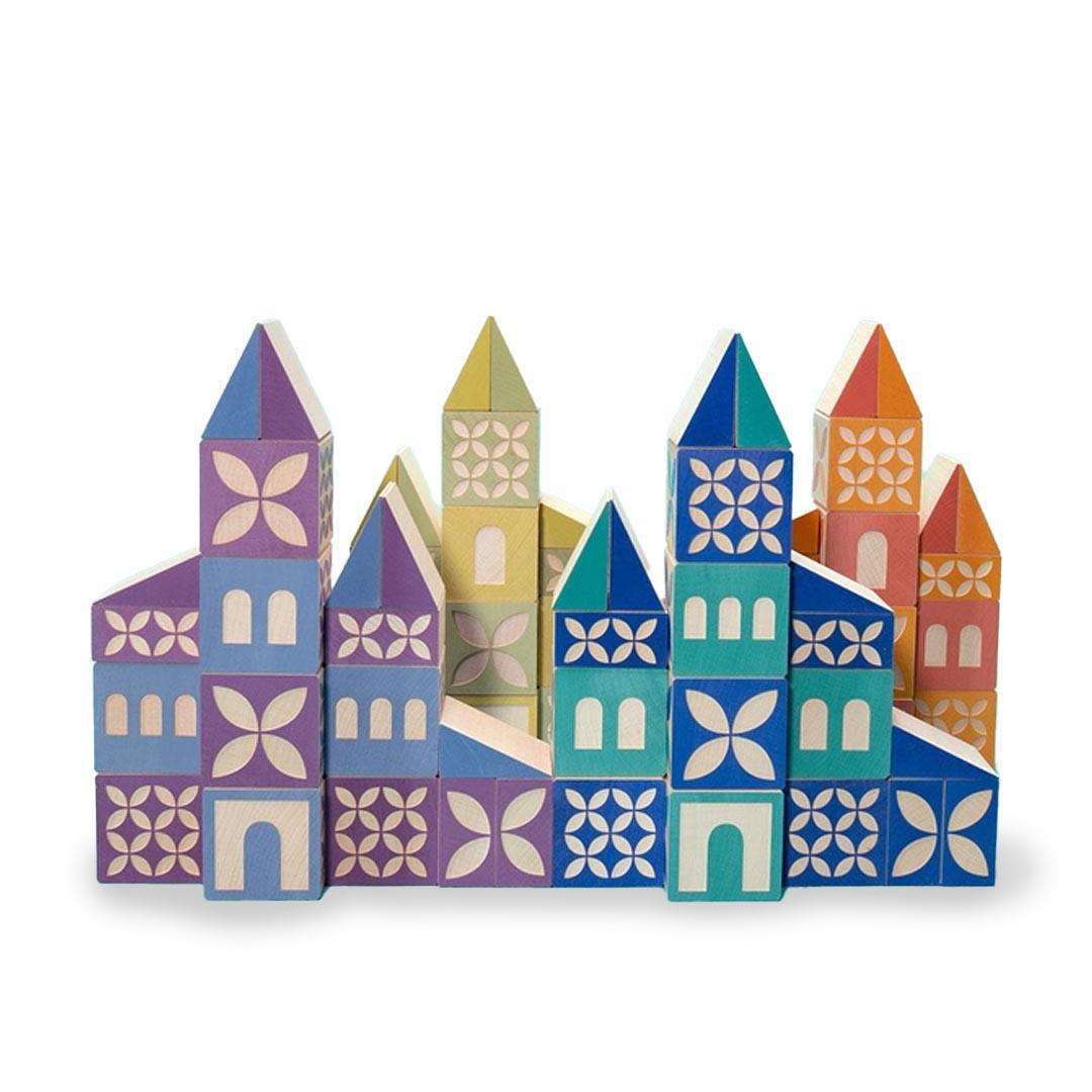 Build your own village with this 80 piece set: 32 blocks, 32 triangles, and 16 half-blocks. Construct buildings, towers, and bridges with bright colors and mod patterns. You'll find a door, a window, or an archway debossed on one side of each block or half-block: a decorative pattern is debossed on its opposing side. Colorful triangles can form rooftops, bridge bases, and more.