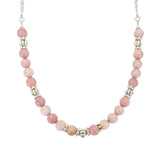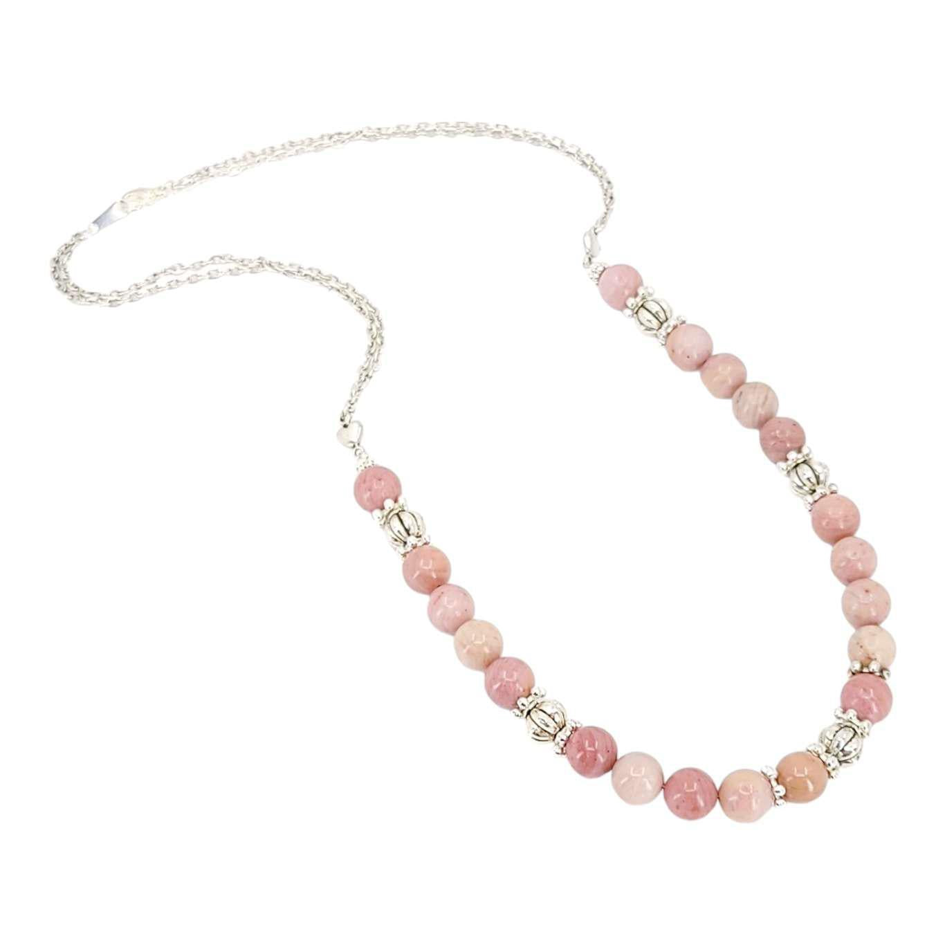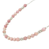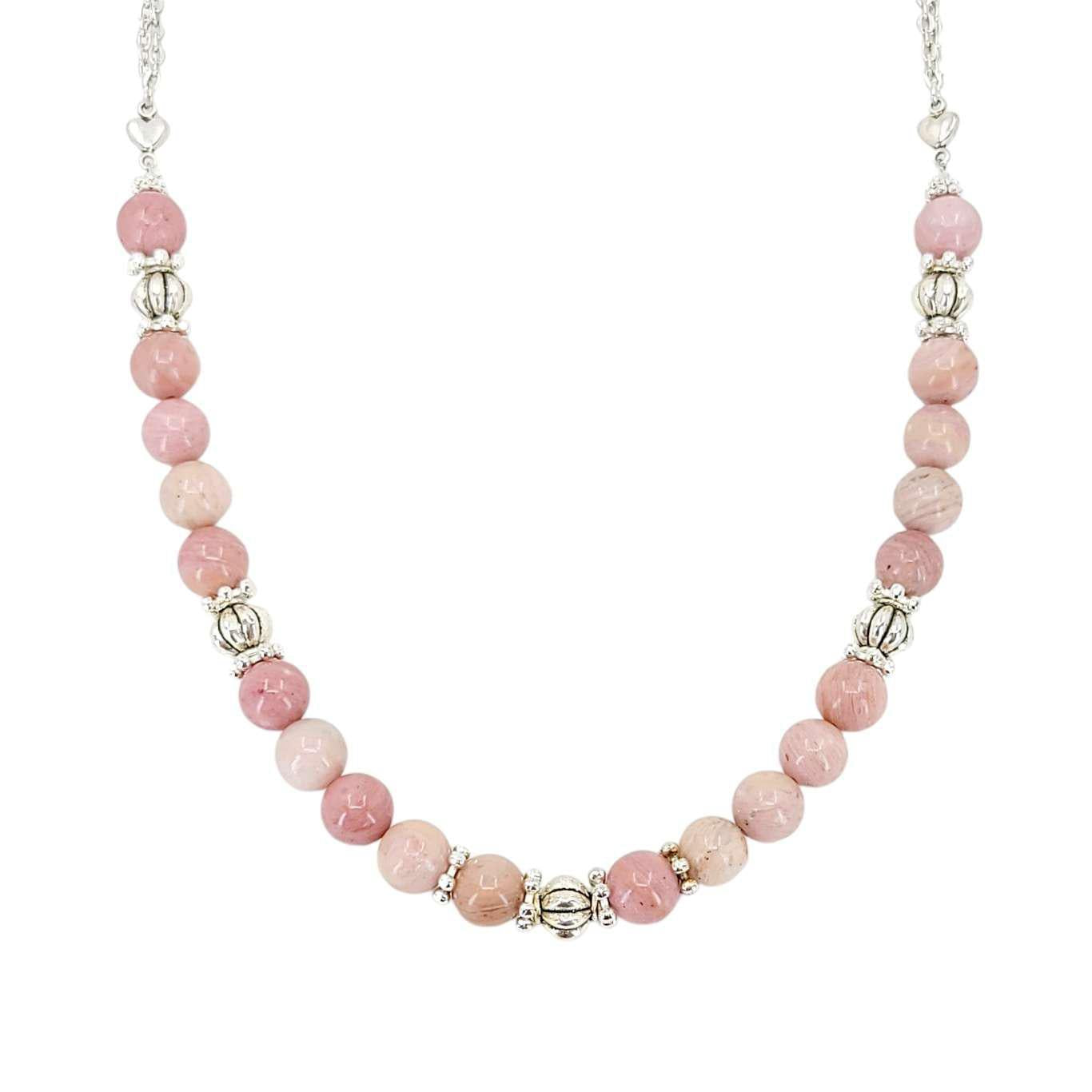 Lovely soft pink rhodonite beads are paired with silver accents (including tiny hearts!) on this beautiful, classic necklace.