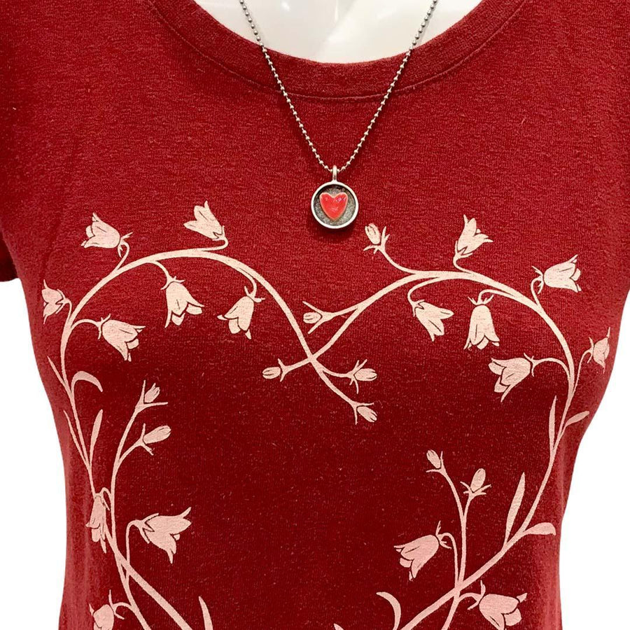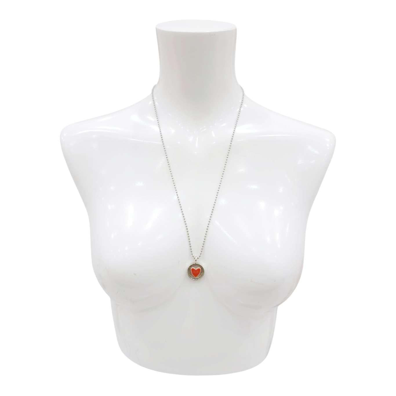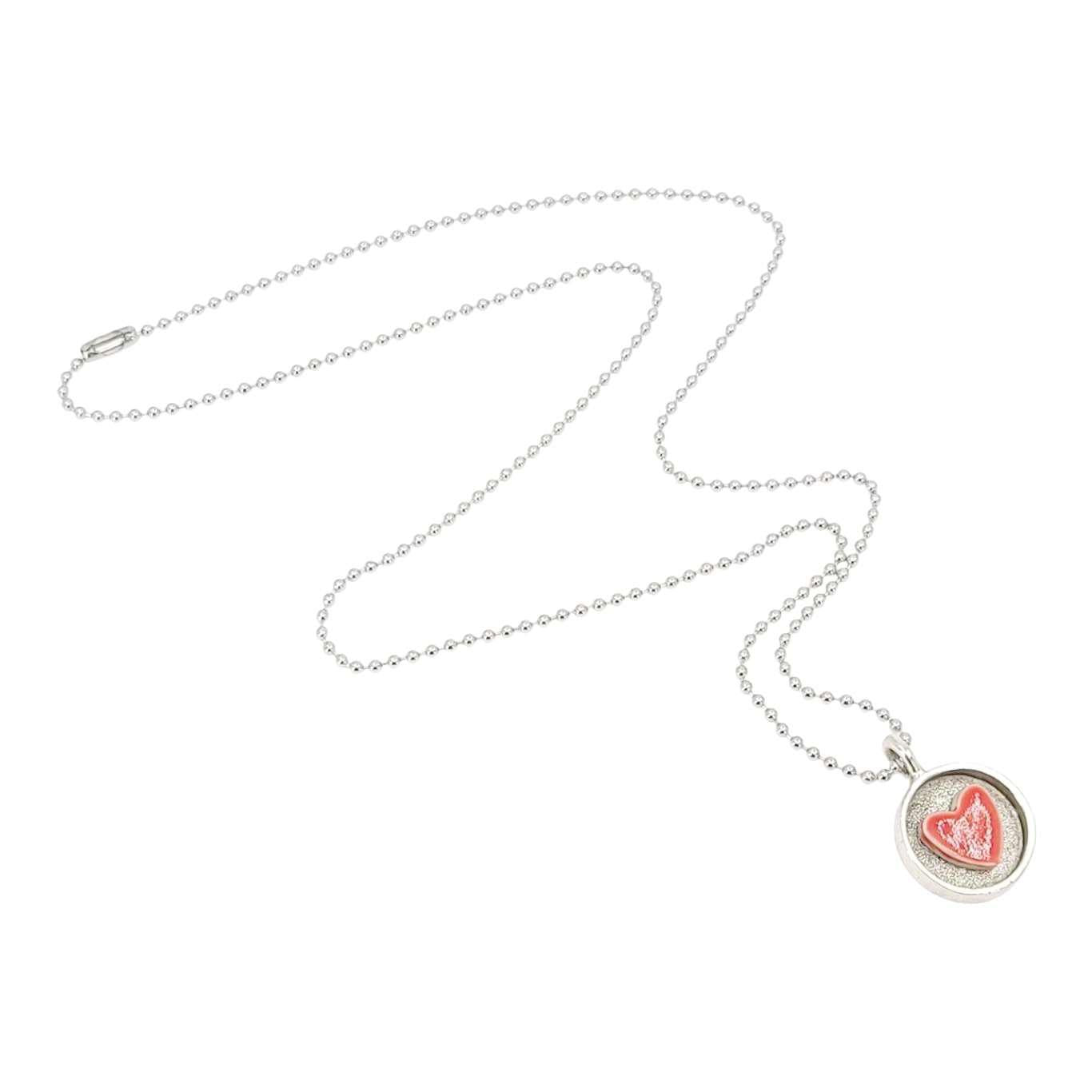 A 1/2in red ceramic heart is set in a round pendant and hung from a stainless steel ball chain to create a super cute and durable necklace.