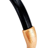 Simple but unique, this bold asymmetric bracelet features a solid black leather band with chunky metal curving around one side of the wrist. The magnetic clasp is easy to open and close one-handed but stays secure on the wrist and has a guard to prevent accidental opening.