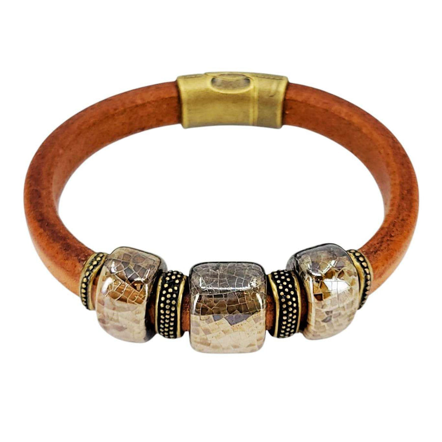 Bracelet - River Rock (Tobacco Leather, Brass, Ceramic) by Diana Kauffman Designs