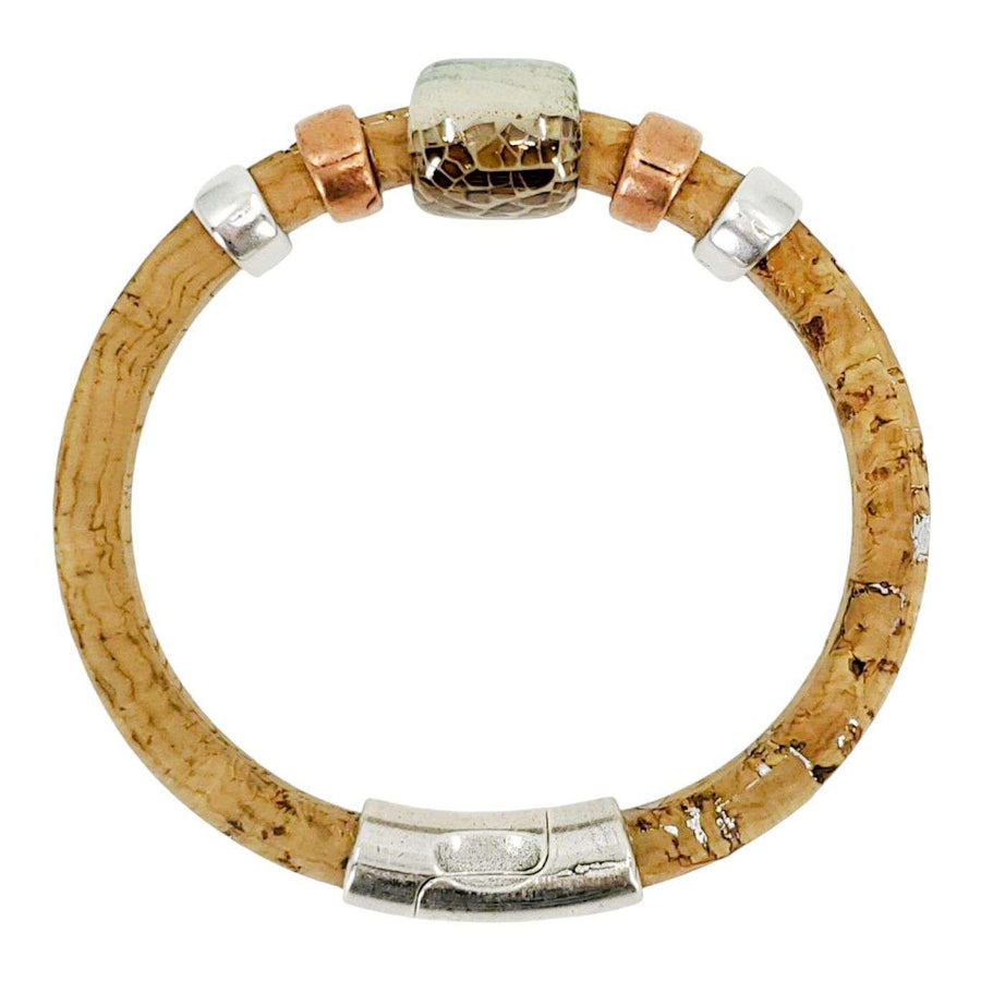 Oceanic blue ceramic and sandy tan cork wood with flecks of silver evoke memories of gentle breezes and warm summer shores on this lovely bracelet.