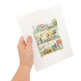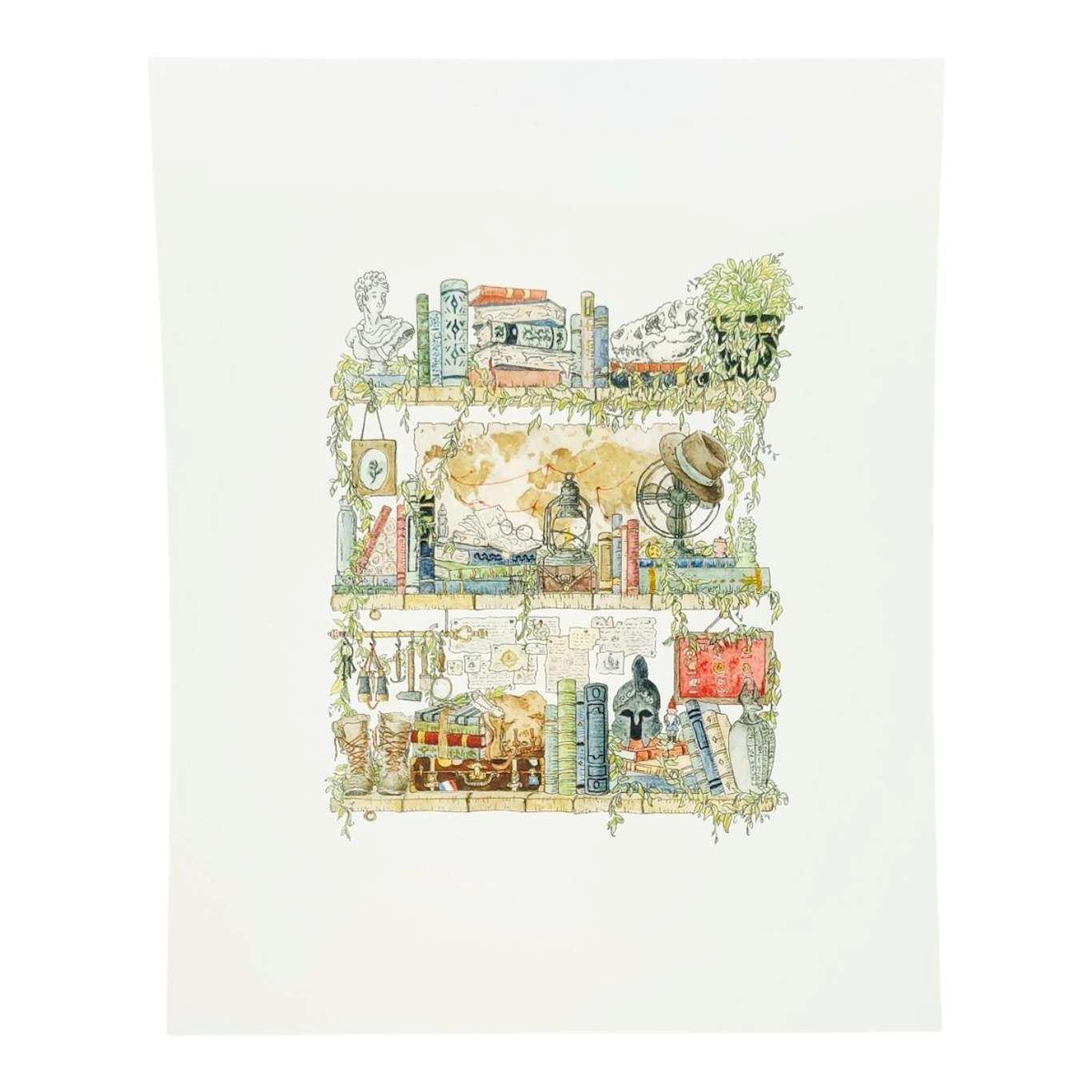 Giclée print featuring an original watercolor and ink illustration of the vintage oddities and books tucked away in the shelves of an archaeologist, including a tiny lawn gnome! This painting was inspired by some of Lizzy's favorite childhood movies, including Indiana Jones, the Mummy, and Jurassic Park. Amazing details abound in Lizzy's whimsical prints!