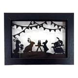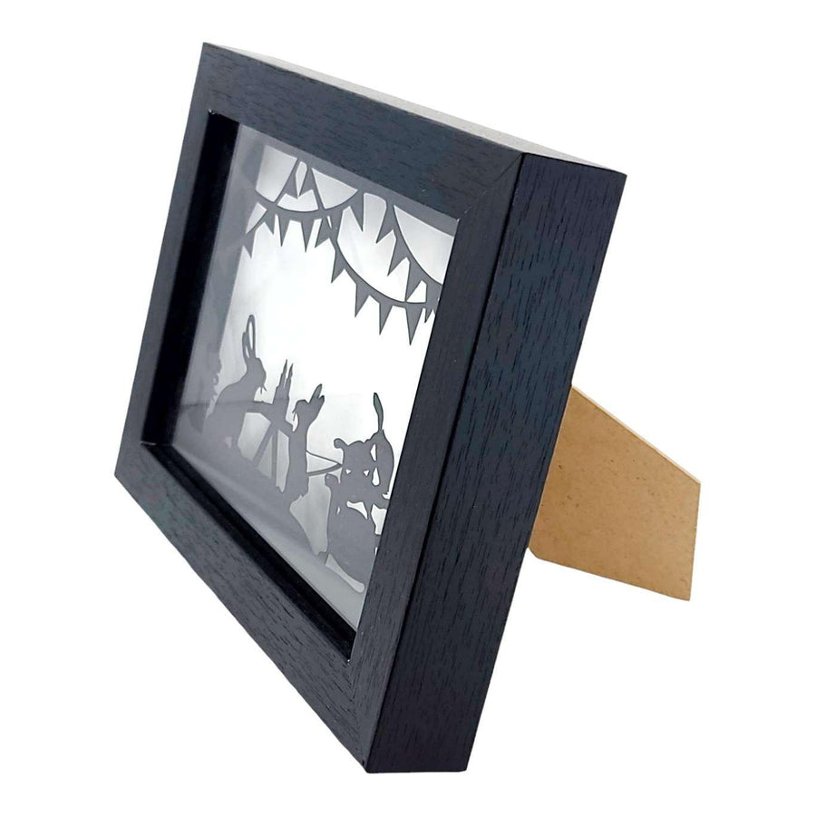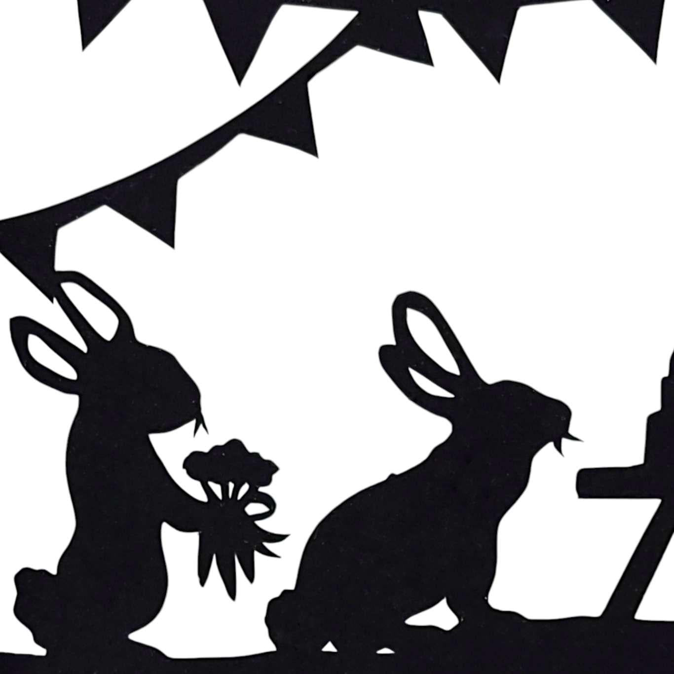 This handmade paper-cut artwork features a Bunny Birthday Party with Turtle Friends.