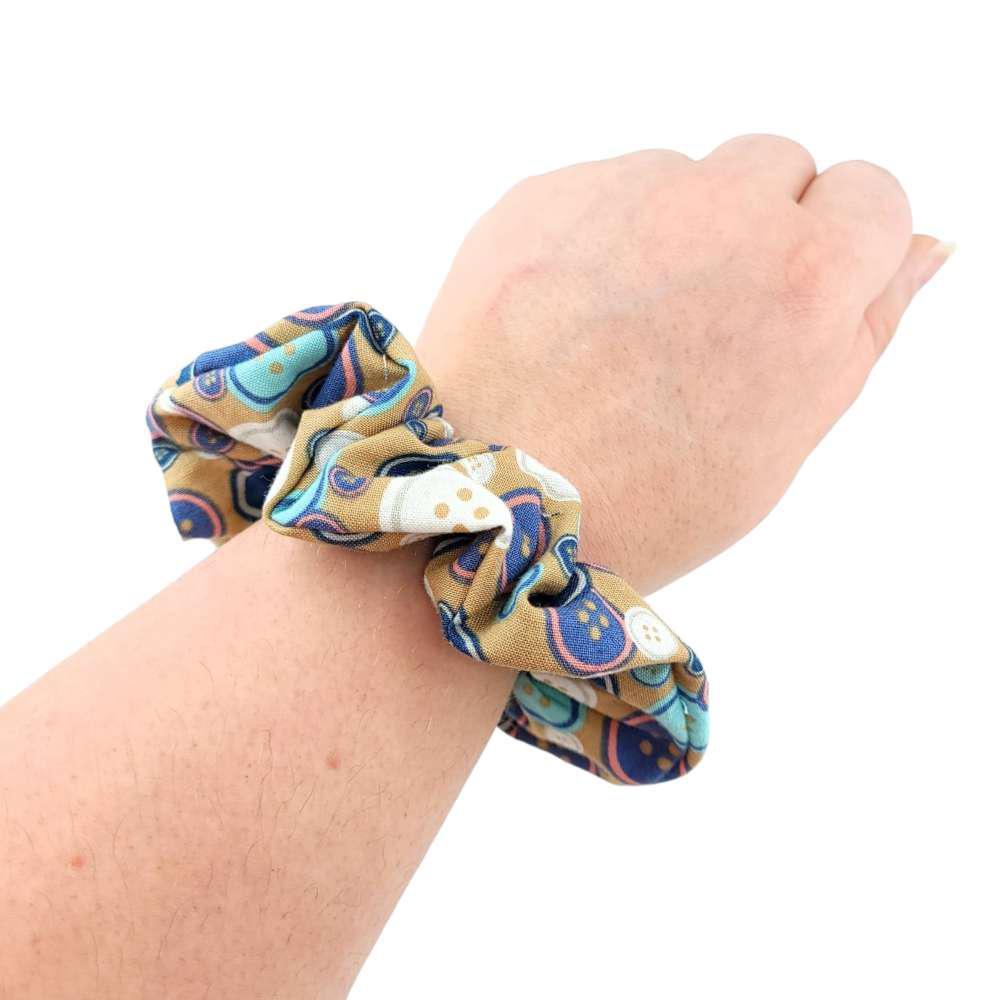 A true classic, this adorable cotton scrunchy featuring a tan background with an assortment of white and blue buttons will keep your hair back in style!
