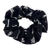 A true classic, this adorable cotton scrunchy featuring a design of assorted large gray wrenches, gears, bolts, and other tools on a black background will keep your hair back in style!