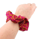 A true classic, this adorable cotton scrunchy featuring a design of gold and orange heart-like curlicues on a pink and burgundy background will keep your hair back in style!