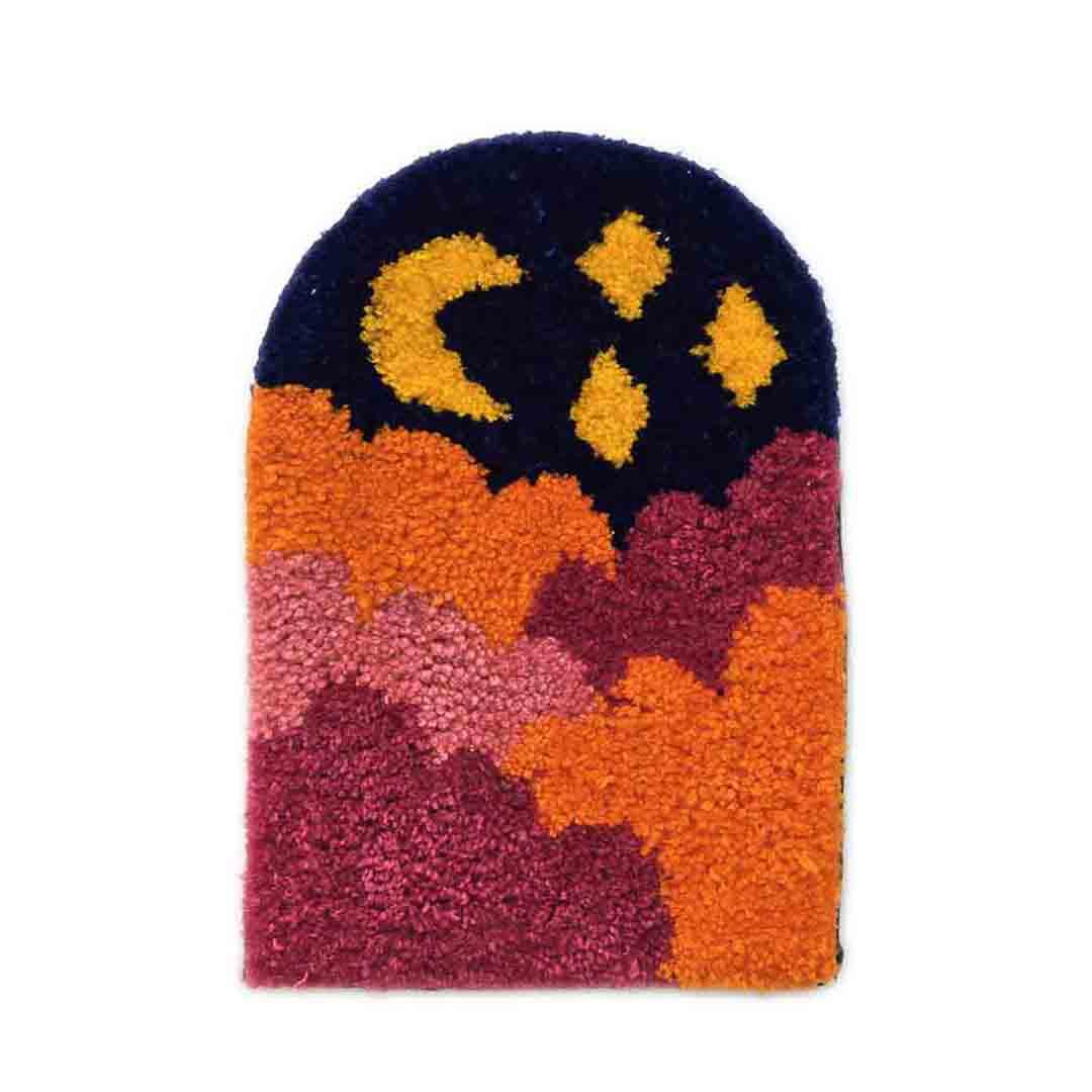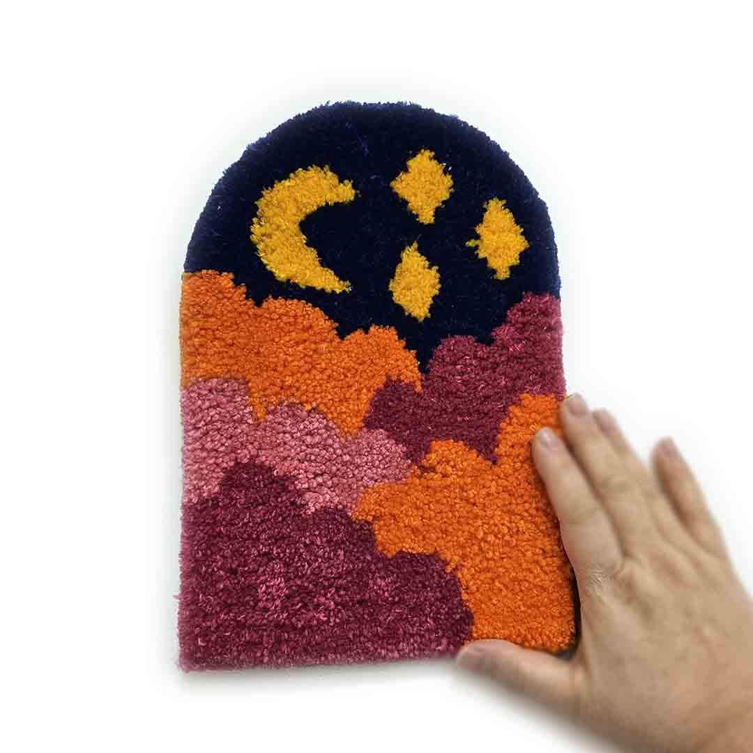 Add some color and fun to your space with an adorable handmade tufted cloud rug wall hanging of a dark blue and magenta midnight sky!